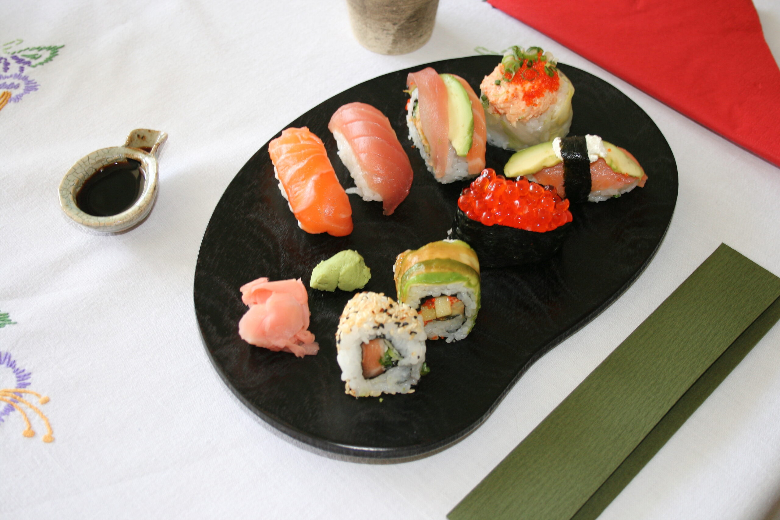 Hölzernes Tablett in Bohnenform. Es wird aus mehreren Schichten des Hyocho-Zai-Baumes (Hokkaido) gefertigt. Mit diesem Tablett kann man sich, auch wenn man mal etwas weniger Zeit hat, dass Frühstück doch geschmackvoll und ansehnlich gestalten. Es eignet sich auch genauso gut für Sushi-Kreationen. Vielleicht gerade für Sushi-Kreationen, da das dunkle Holz zusammen mit dem Sushi einen wunderschönen Kontrast bietet. Das Auge isst bekanntlich mit….. Die Abmessungen betragen 27 cm in der Breite, 18,5 cm in der Tiefe und ca. 0,7 cm in der Höhe. Das Gewicht beträgt ca. 250 Gramm. Nicht geeignet für Mikrowellenherde und Geschirrspüler.
