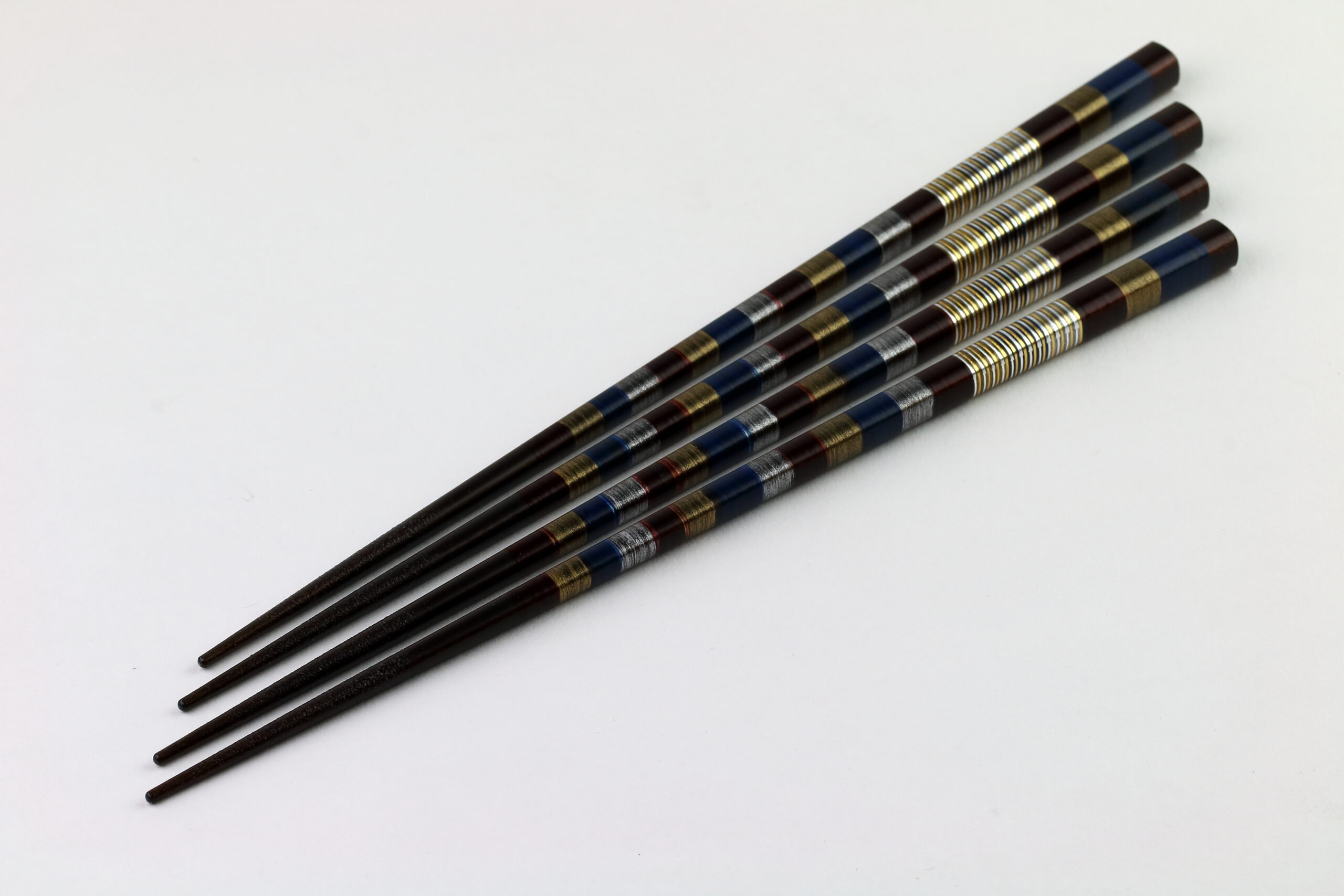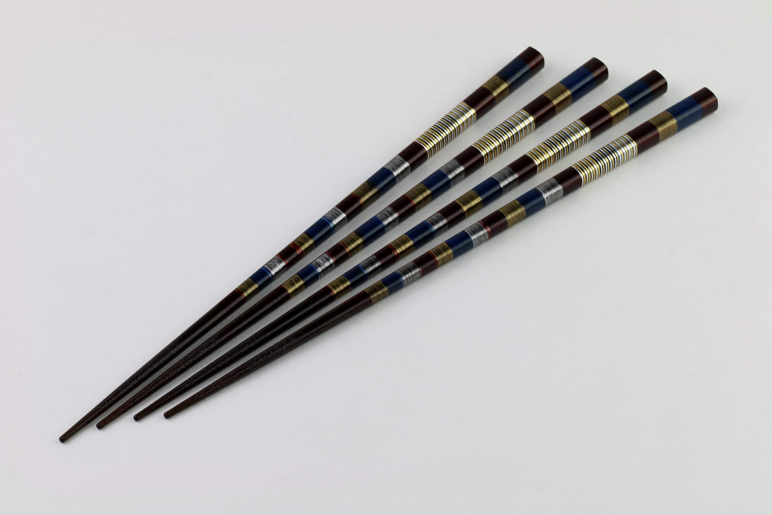Bei diesem Hashi-Set handelt es sich um einen eher modernen Stil, daher die Bezeichnung, die soviel wie -exotisch- bedeutet. Die quergestreifte, farbenfrohe Musterung passt perfekt zu dem dunklen Holz. Dieses Set wurde ebenfalls mit einer gleitsicheren, rauhen Spitze versehen. Sie eignen sich besonders für japanische Nudelgerichte. Die Länge dieser Hashi beträgt 22,5cm.