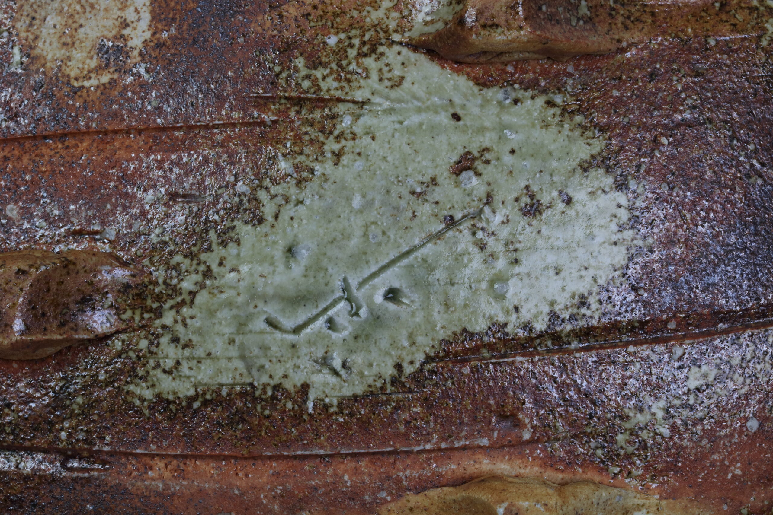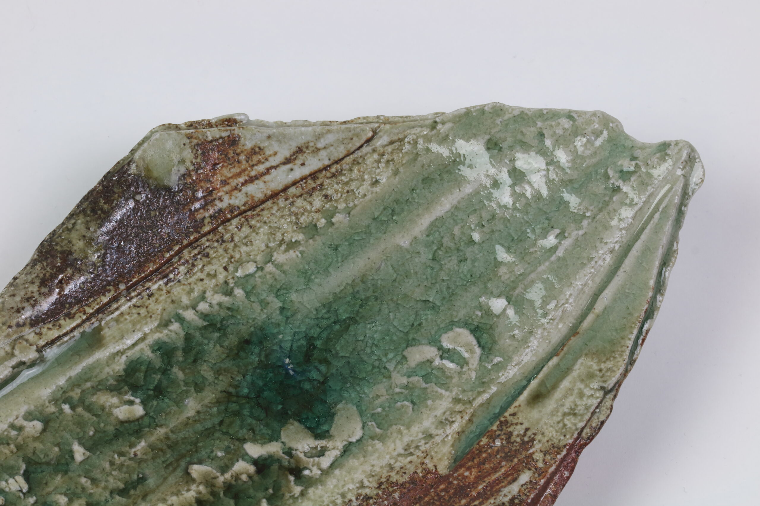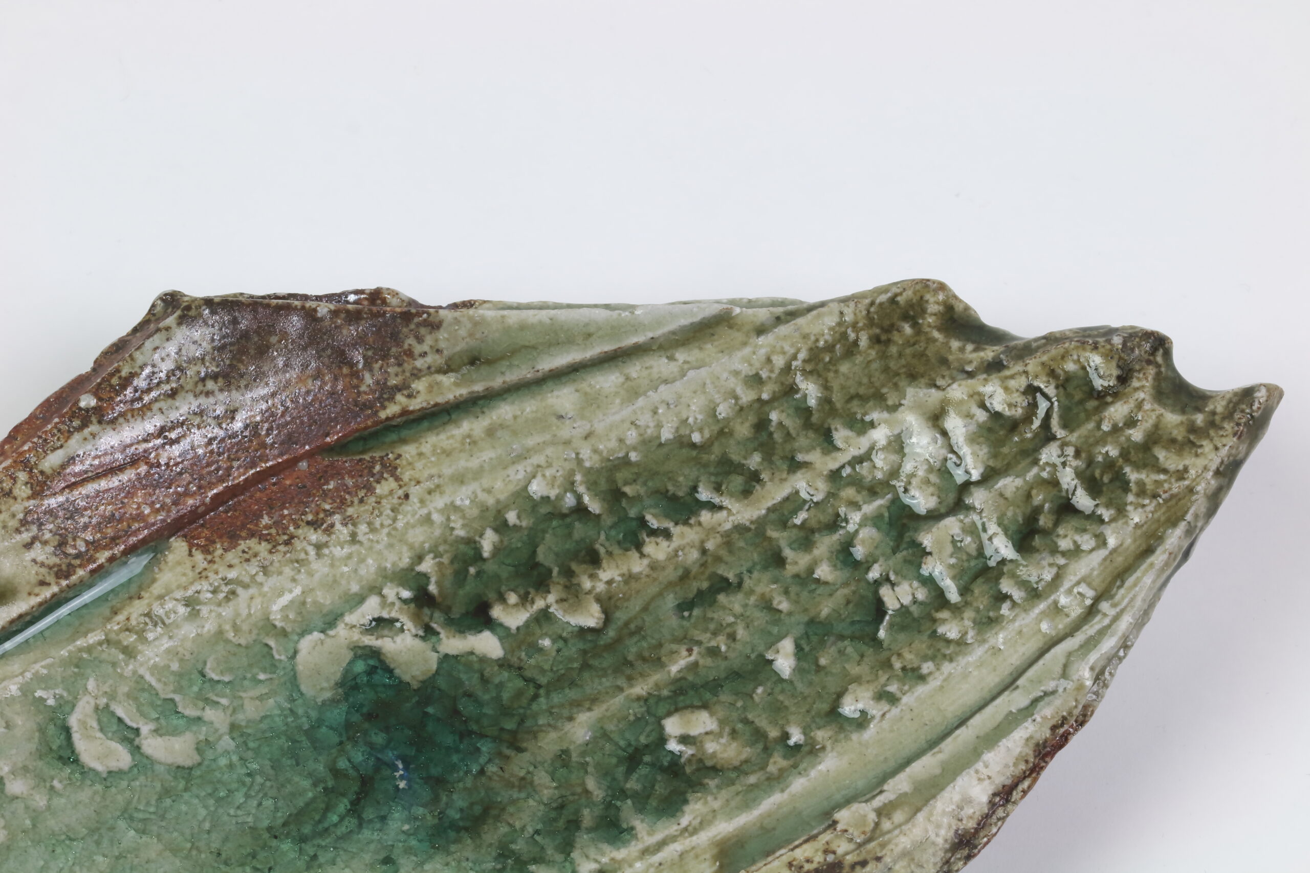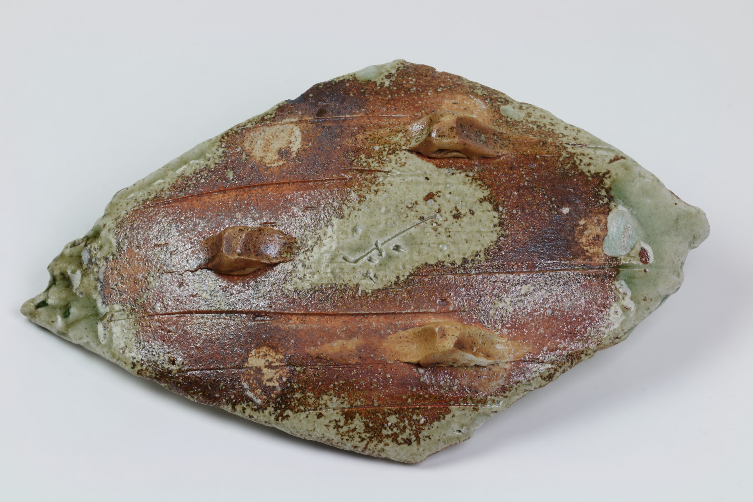 Ein weiteres, absolutes Schmuckstück unter den Keramikplatten, es handelt sich hier übrigens um den „Bruder“ von Produkt 60191. Mit dieser kühnen Modellierung verleiht diese Keramik jedem Sushi-Dinner einen nachhaltigen Eindruck. Eine unverzichtbare Keramik für ein unvergessliches Erlebnis! Diese Keramik wurde im -Iga Ueno Sanken Ofen- hergestellt und stammt somit ebenfalls aus der Iga-Region, dem nordwestlichen Teil der Präfektur Mie. Diese Gegend stellt auch den Ursprung der sogenannten Igaryu-Ninja-Schule dar, die Schule des berühmtesten Ninja-Clans in der Geschichte Japans. Ebenso wurde diese Keramik mit einer moosgrünen Asche-Glasur, der Iga-Asche-Glasur, versehen. Mit der Zeit zeichnen sich in der Glasur „Linien“ oder auch „Risse“ ab. Dieser Effekt wird gezielt herbeigeführt. Auf dem letzten Foto sehen Sie das Zeichen des Töpfers.