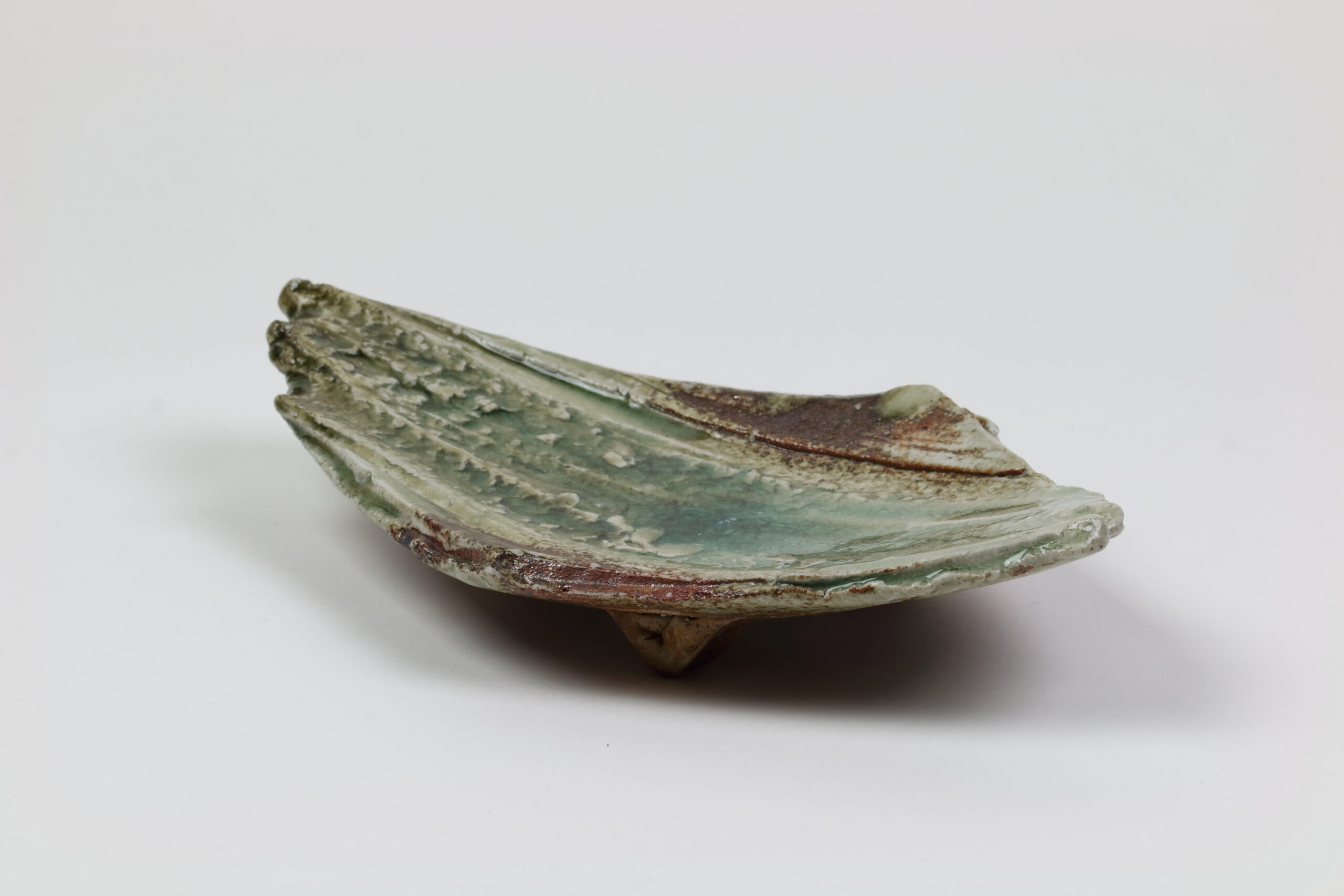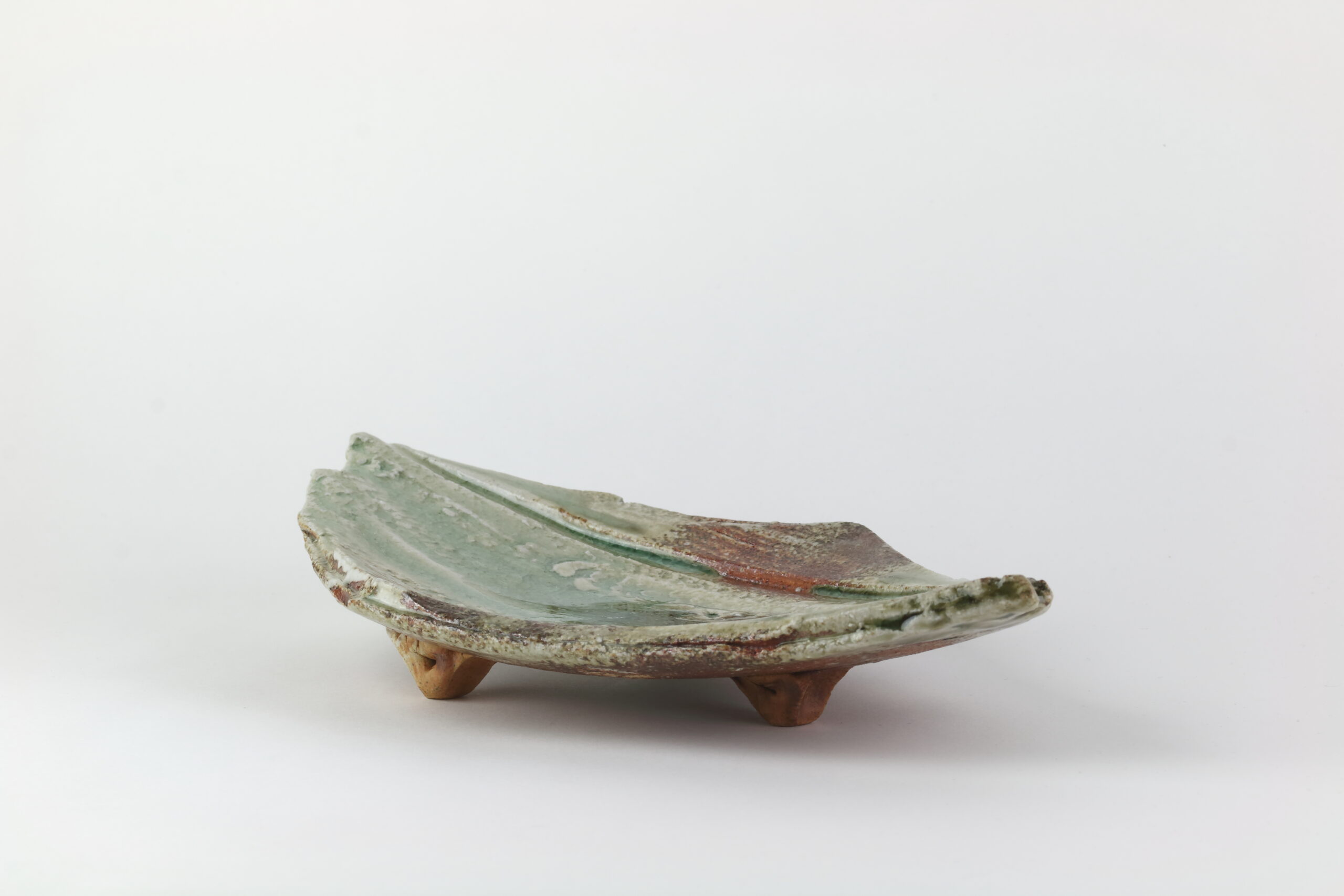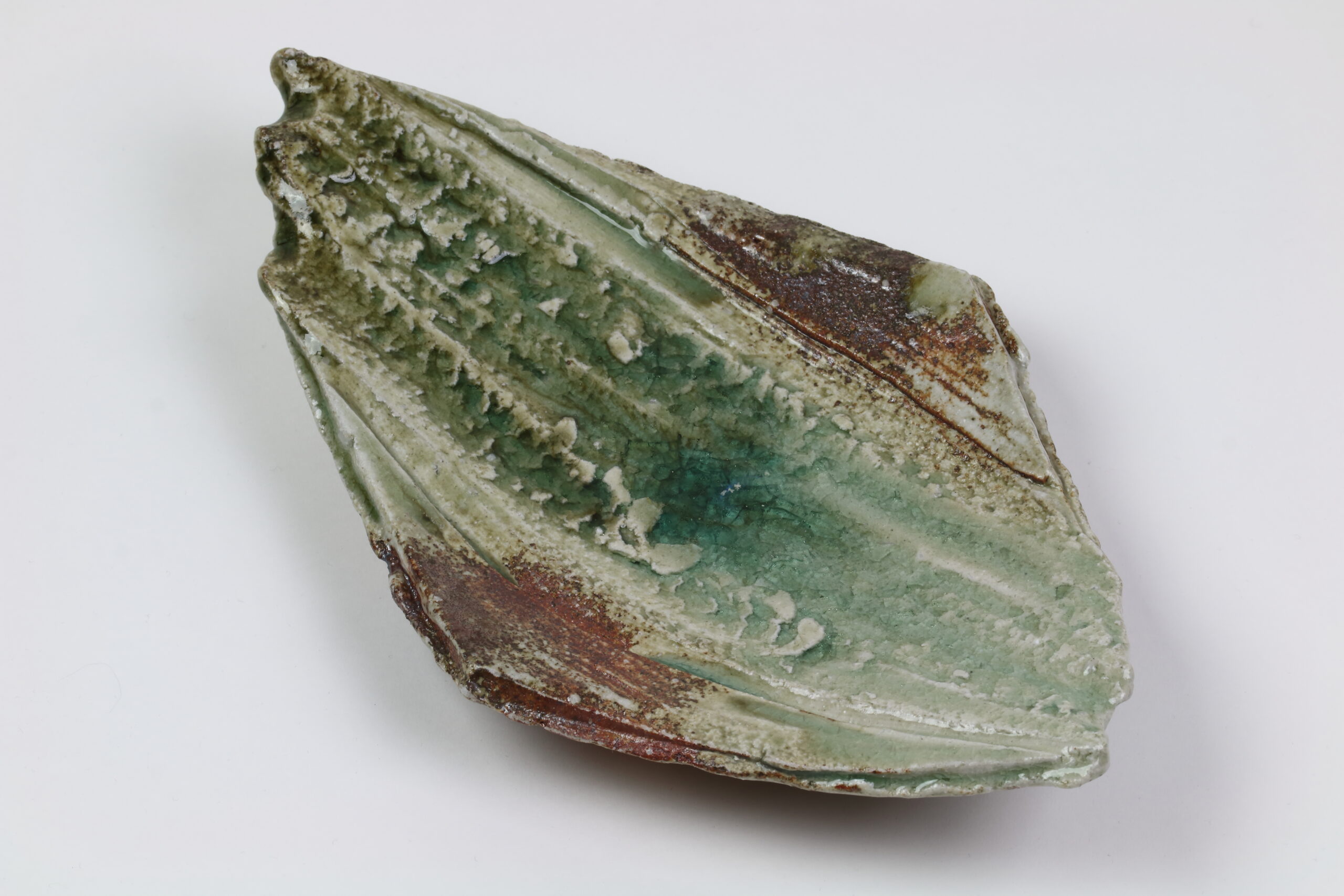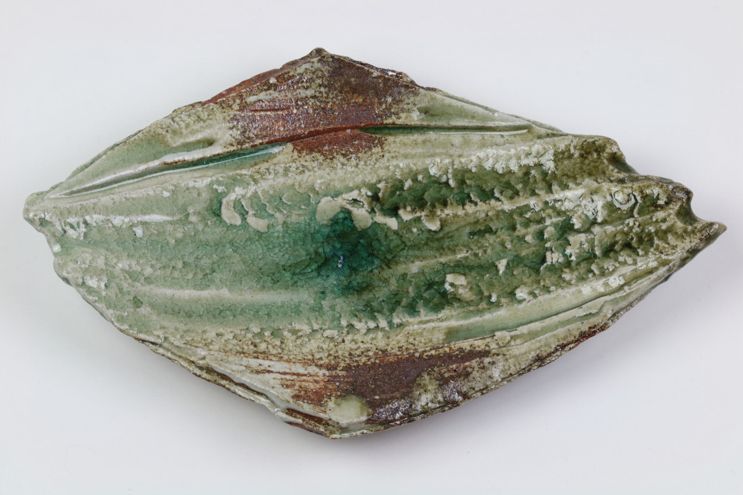Ein weiteres, absolutes Schmuckstück unter den Keramikplatten, es handelt sich hier übrigens um den „Bruder“ von Produkt 60191. Mit dieser kühnen Modellierung verleiht diese Keramik jedem Sushi-Dinner einen nachhaltigen Eindruck. Eine unverzichtbare Keramik für ein unvergessliches Erlebnis! Diese Keramik wurde im -Iga Ueno Sanken Ofen- hergestellt und stammt somit ebenfalls aus der Iga-Region, dem nordwestlichen Teil der Präfektur Mie. Diese Gegend stellt auch den Ursprung der sogenannten Igaryu-Ninja-Schule dar, die Schule des berühmtesten Ninja-Clans in der Geschichte Japans. Ebenso wurde diese Keramik mit einer moosgrünen Asche-Glasur, der Iga-Asche-Glasur, versehen. Mit der Zeit zeichnen sich in der Glasur „Linien“ oder auch „Risse“ ab. Dieser Effekt wird gezielt herbeigeführt. Auf dem letzten Foto sehen Sie das Zeichen des Töpfers.