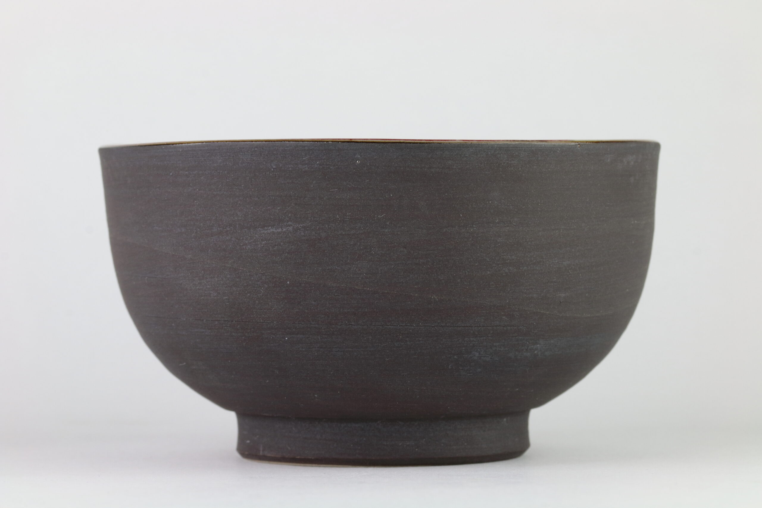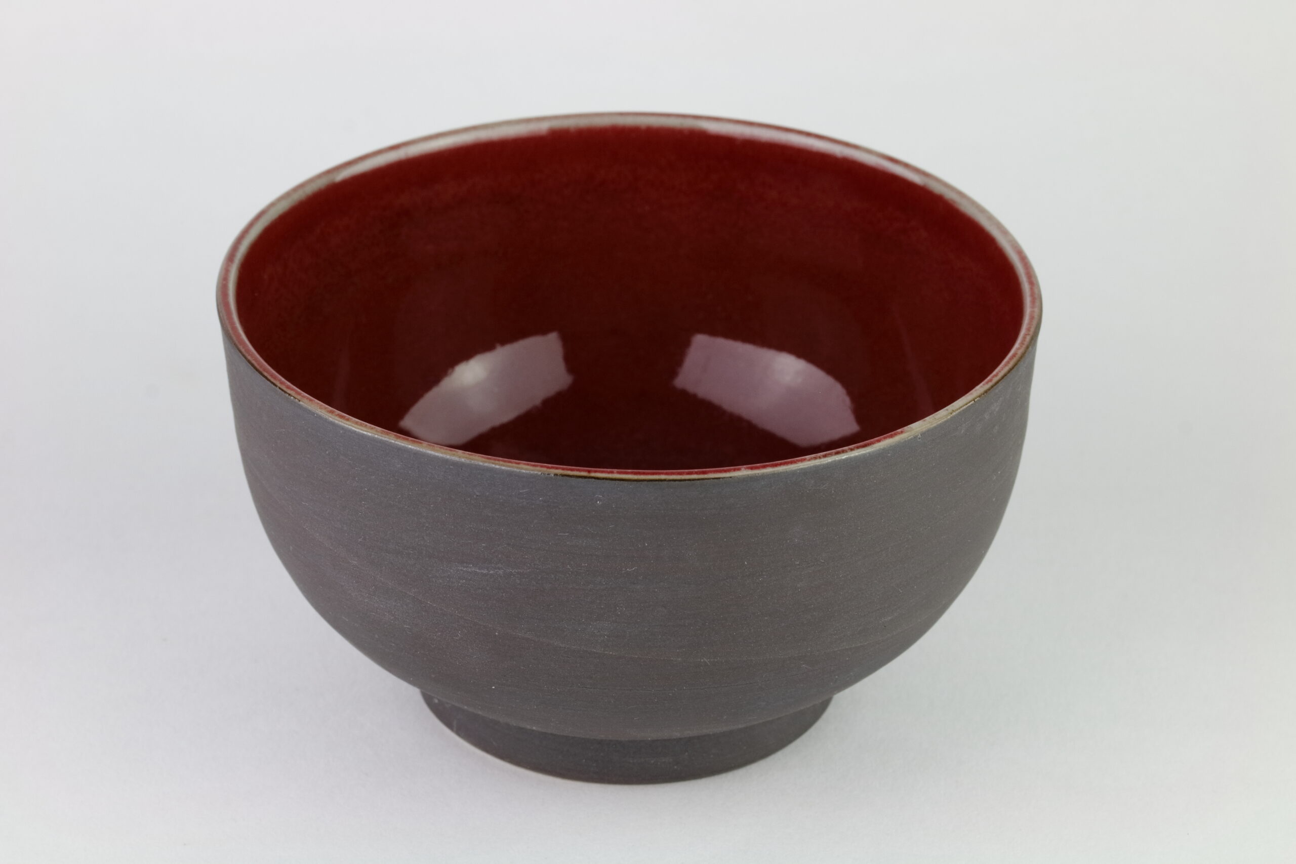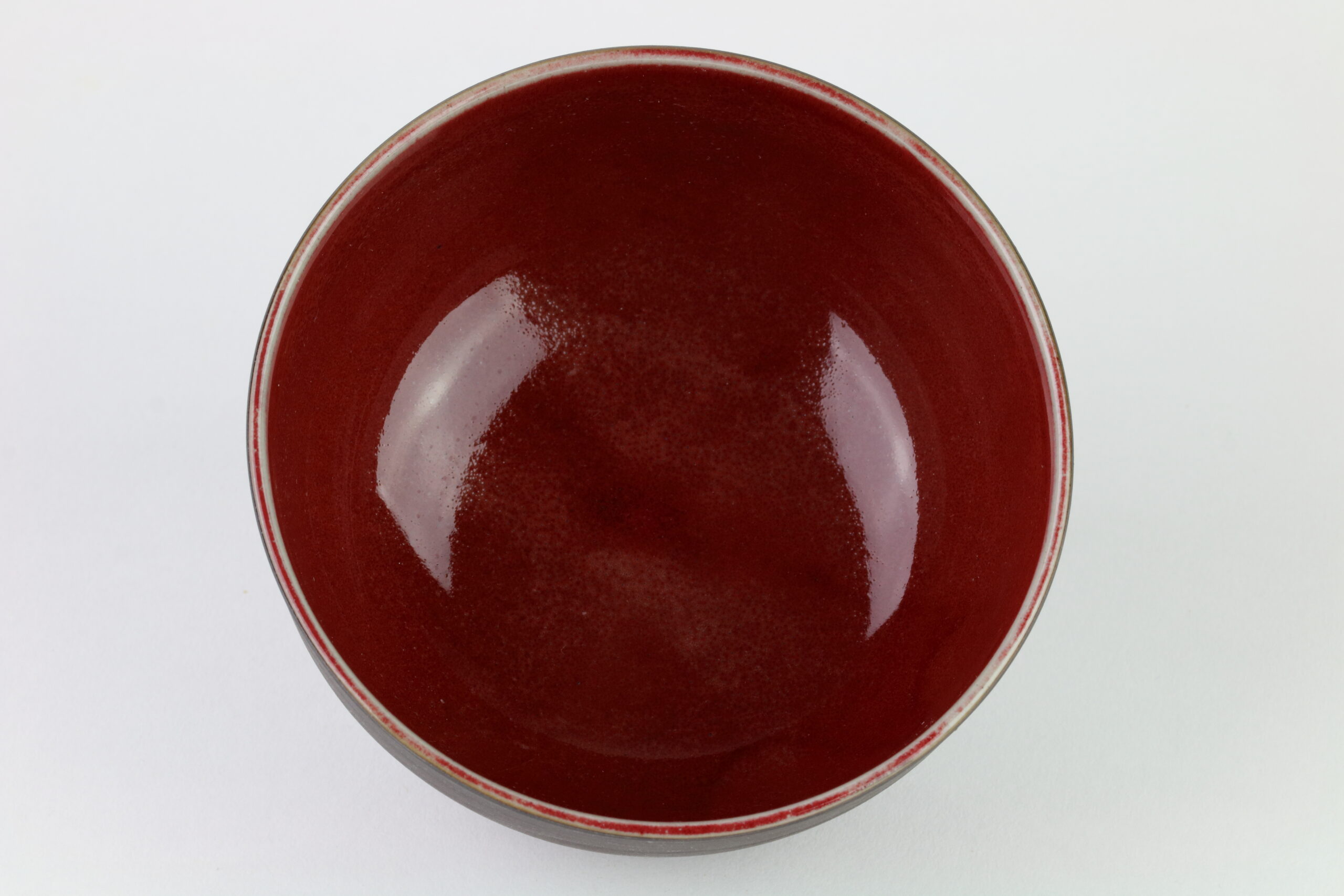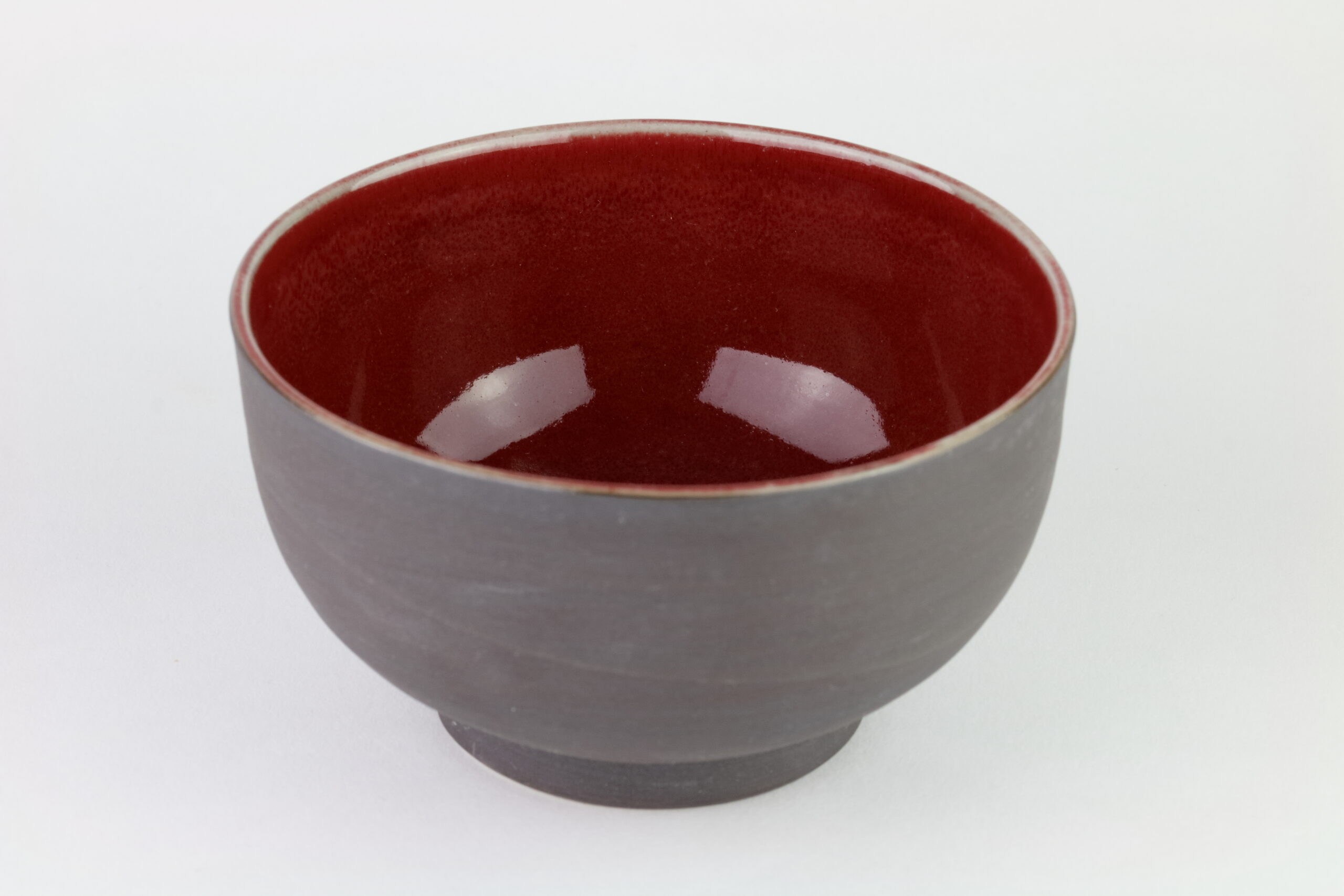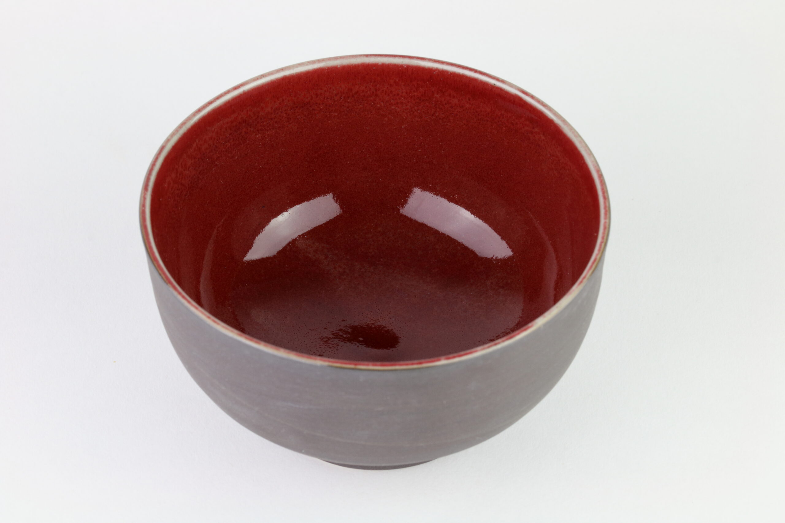 Extravagante Keramikschale, die sich nicht nur für Suppen, sondern auch für Desserts wie Eis, hervorragend eignet. Die Schale vereint Einfach und Pracht. Die Außenseite hat eine leicht rauhe Textur, die Innenseite zeigt warme, sanfte, zinnoberrote Glasur. Mitunter sind in der Glasur kleine, schwarze Punkte zu sehen, diese entstehen beim Brennvorgang durch Eisenpulver. Die Glasur ist außerdem kupferhaltig und sehr schwer herzustellen, weshalb die Anzahl der Schöpfer solcher Glasuren stetig abnimmt. Wenn Keramik im Ofen gebrannt wird, bewirkt dies eine Veränderung in der Glasur, diesen Vorgang nennt man „Ofenwechsel“. Die Glasur der hier dargestellten Keramik nennt man: Shinsha Yu-yaku. Auf dem letzten Bild sehen Sie das Siegel des Designers.