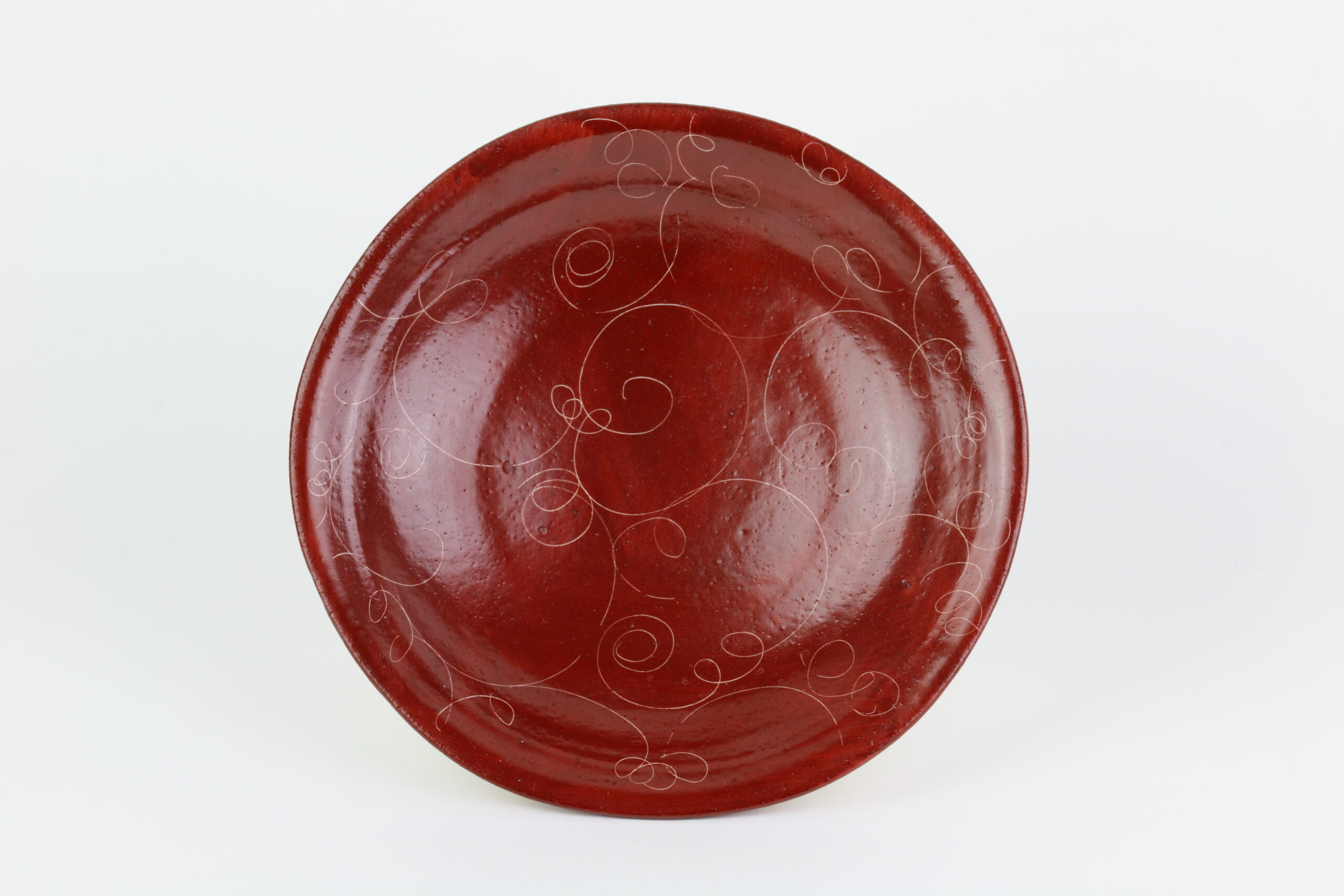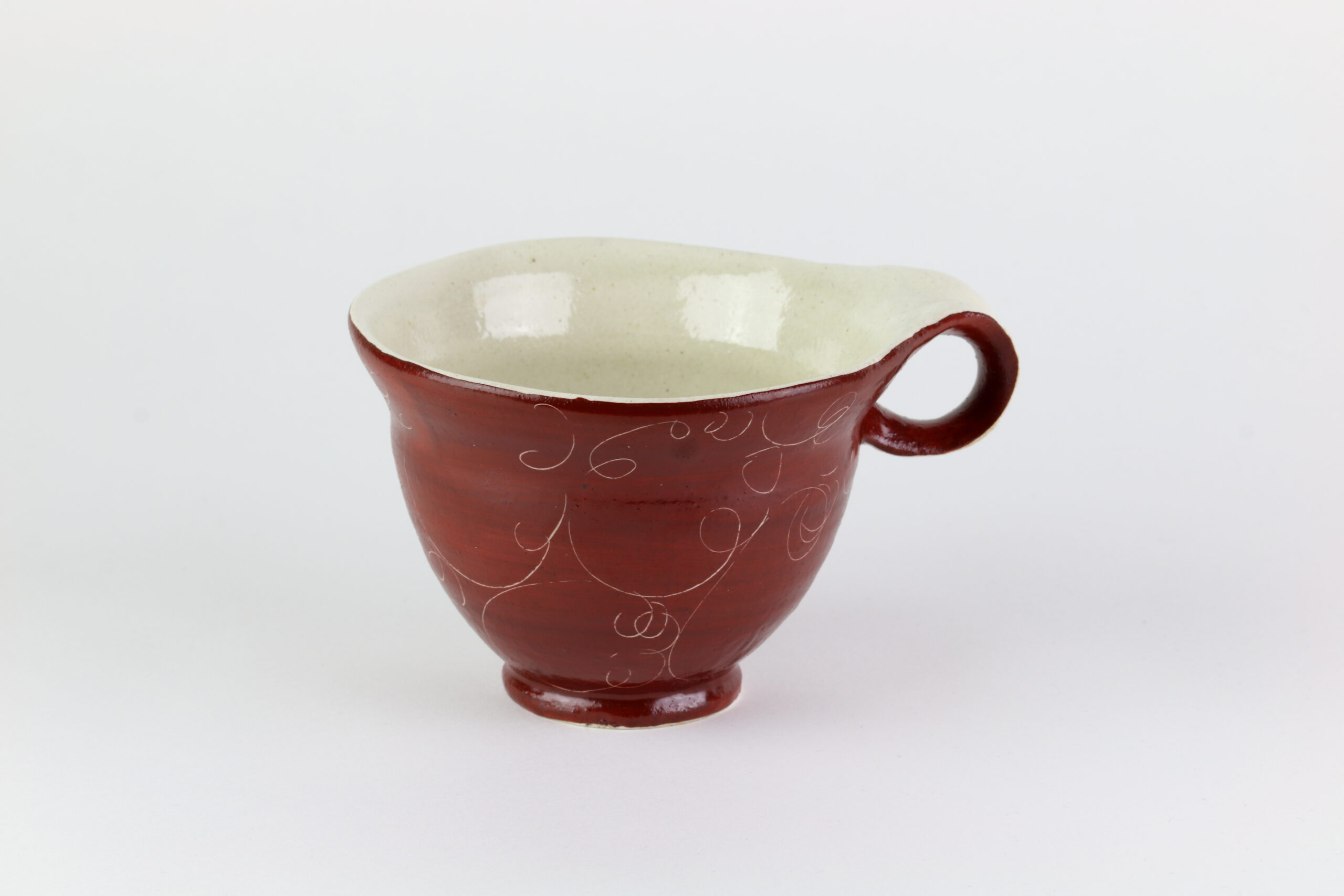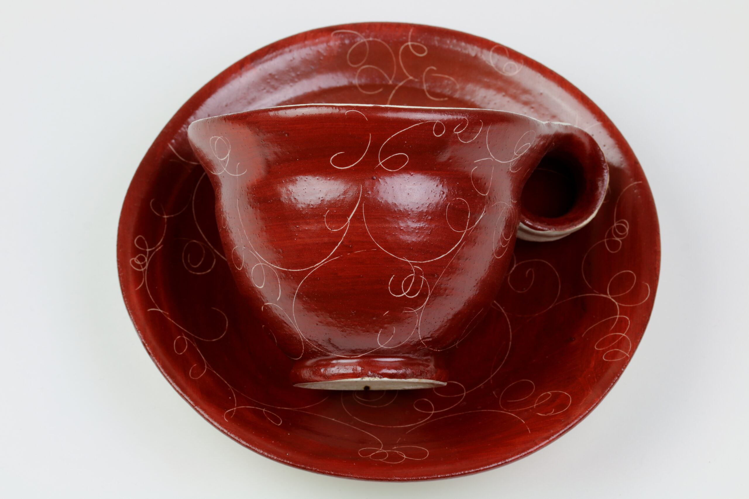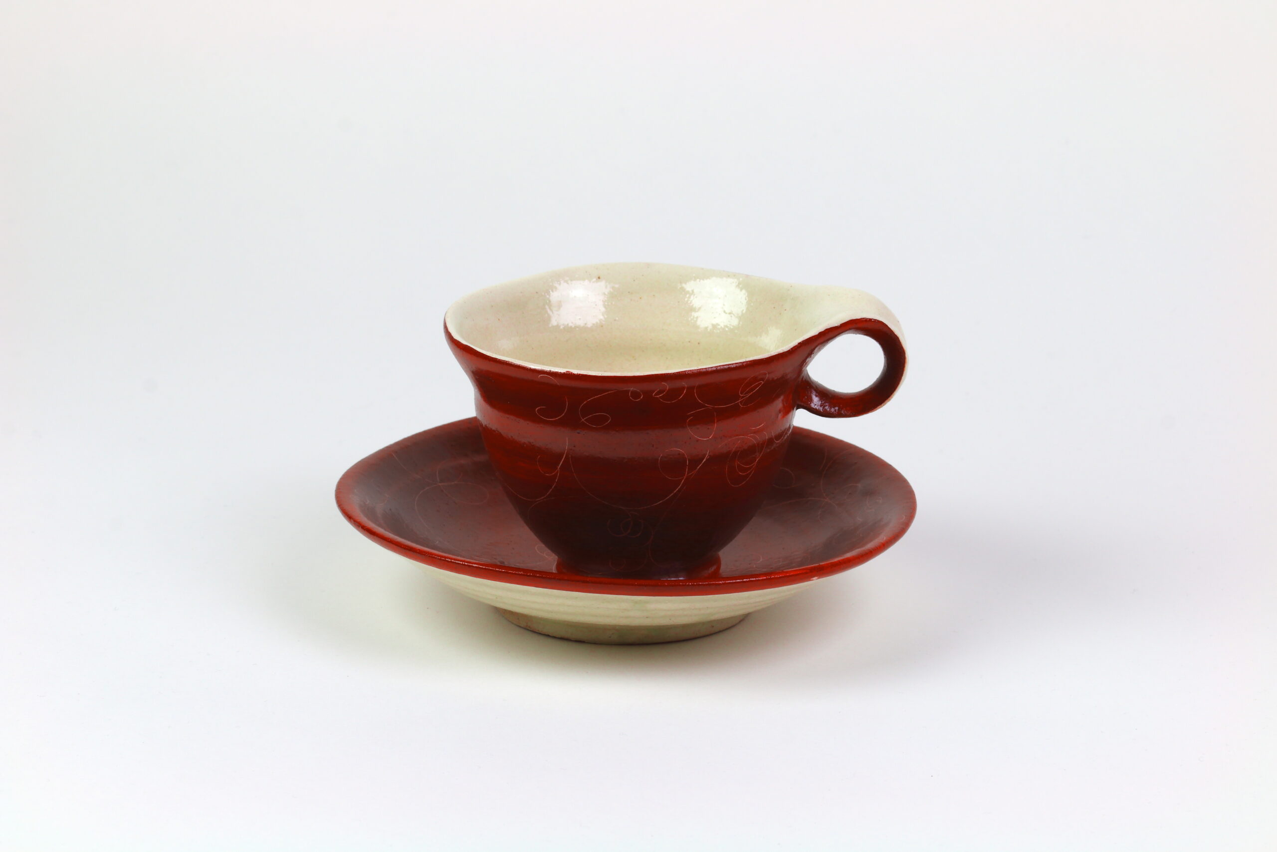 Bei dieser Teetasse handelt es sich um eine Komatsu-Tasse, die als hochwertiges Keramikmodell und Sammlerstück konzipiert wurde. Das Augenmerk liegt auf der Ergonomie durch den speziell geformten Rand und Henkel, die für eine angenehme Handhabung sorgen. Der Begriff -Akae Senmoyou- bedeutet soviel wie: Rotes Linienmuster. Die dünnen, weißen Linien bilden einen schönen Kontrast zur roten Färbung der Tassen. Sie wurden von Hand aufgetragen. Die Innenseiten der Tassen wie auch die Unterseite der Untertassen ist cremefarben glasiert. Auf der Untertasse sind, außerhalb des Zentrums, teils fünf kleine „Kratzspuren“ zu sehen, sie werden „Meato“ genannt. Diese entstehen durch kleine Tonkörner, die zwischen die gestapelten Teller gelegt werden, damit sie im Ofen nicht zusammenkleben. Abgesehen davon dienen sie auch als Nachweis, dass es sich hier nicht um industrielle Massenware, sondern um handwerkliche,  im traditionellen Verfahren hergestellte Keramik handelt.