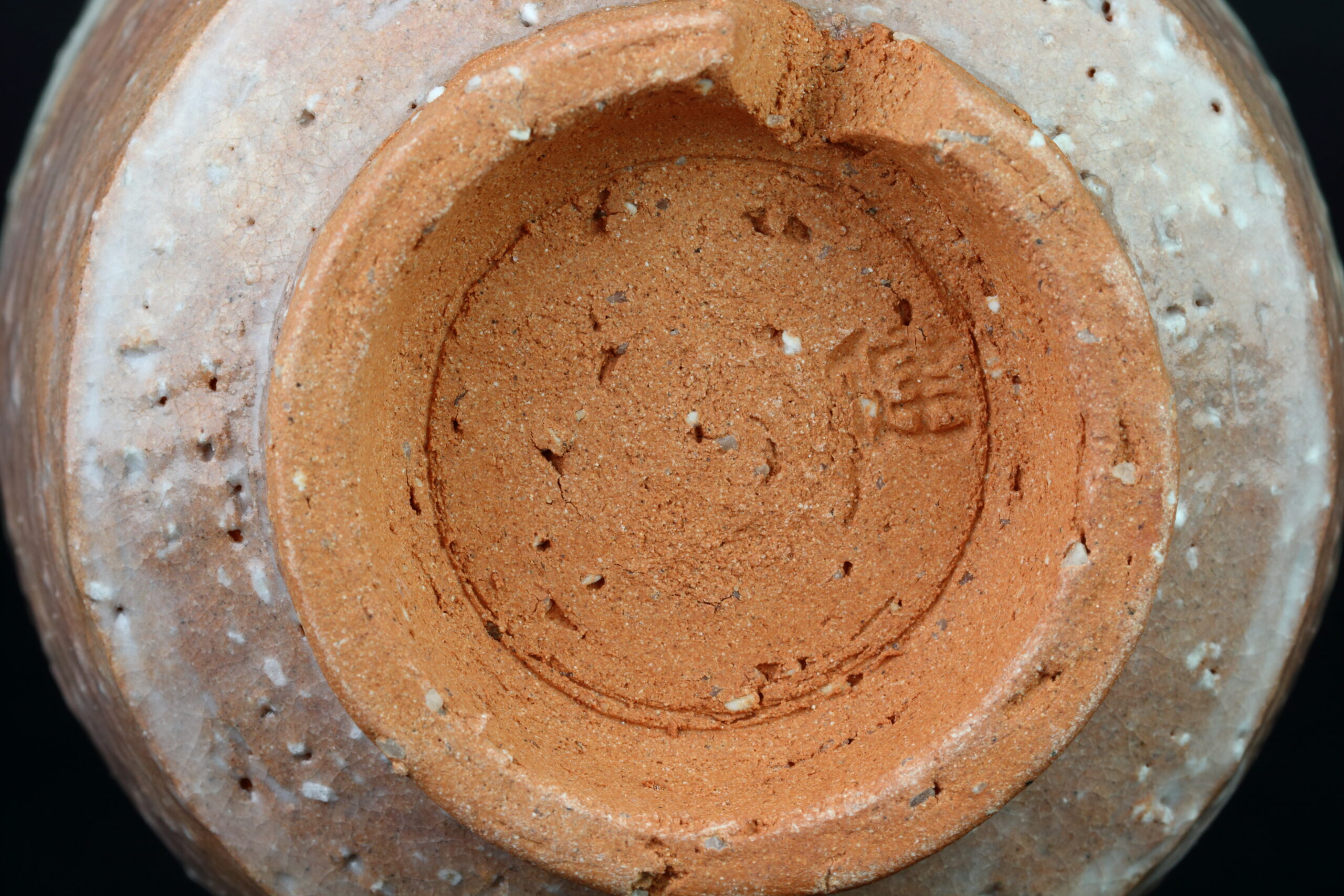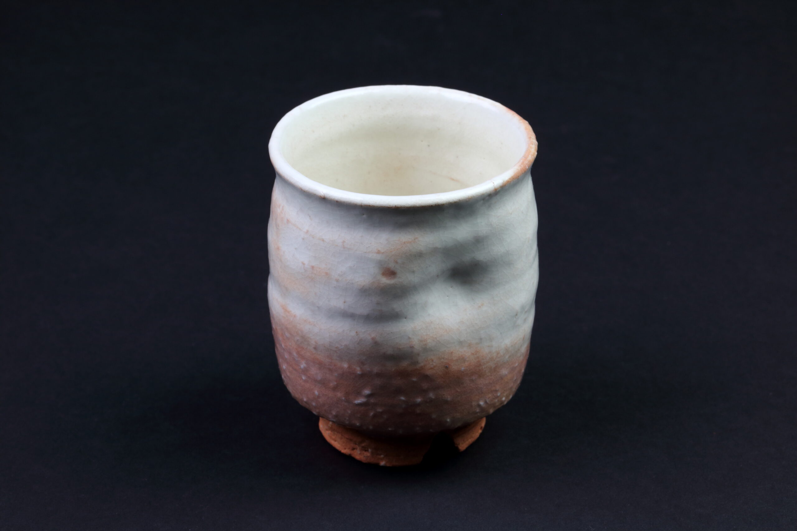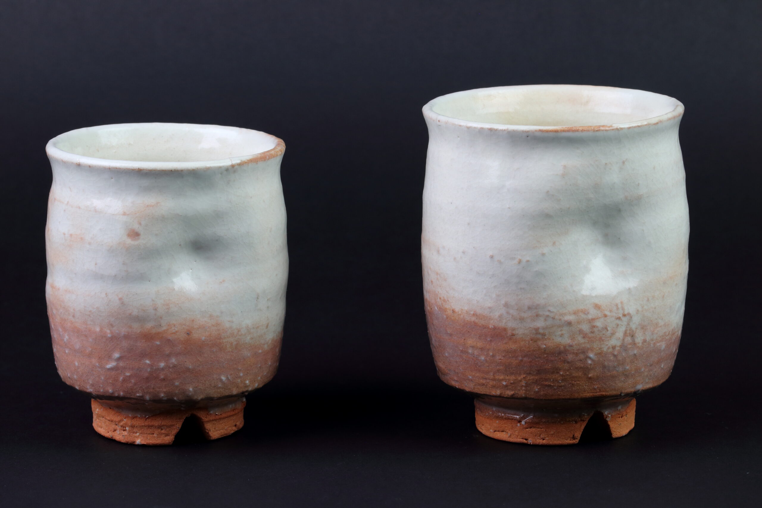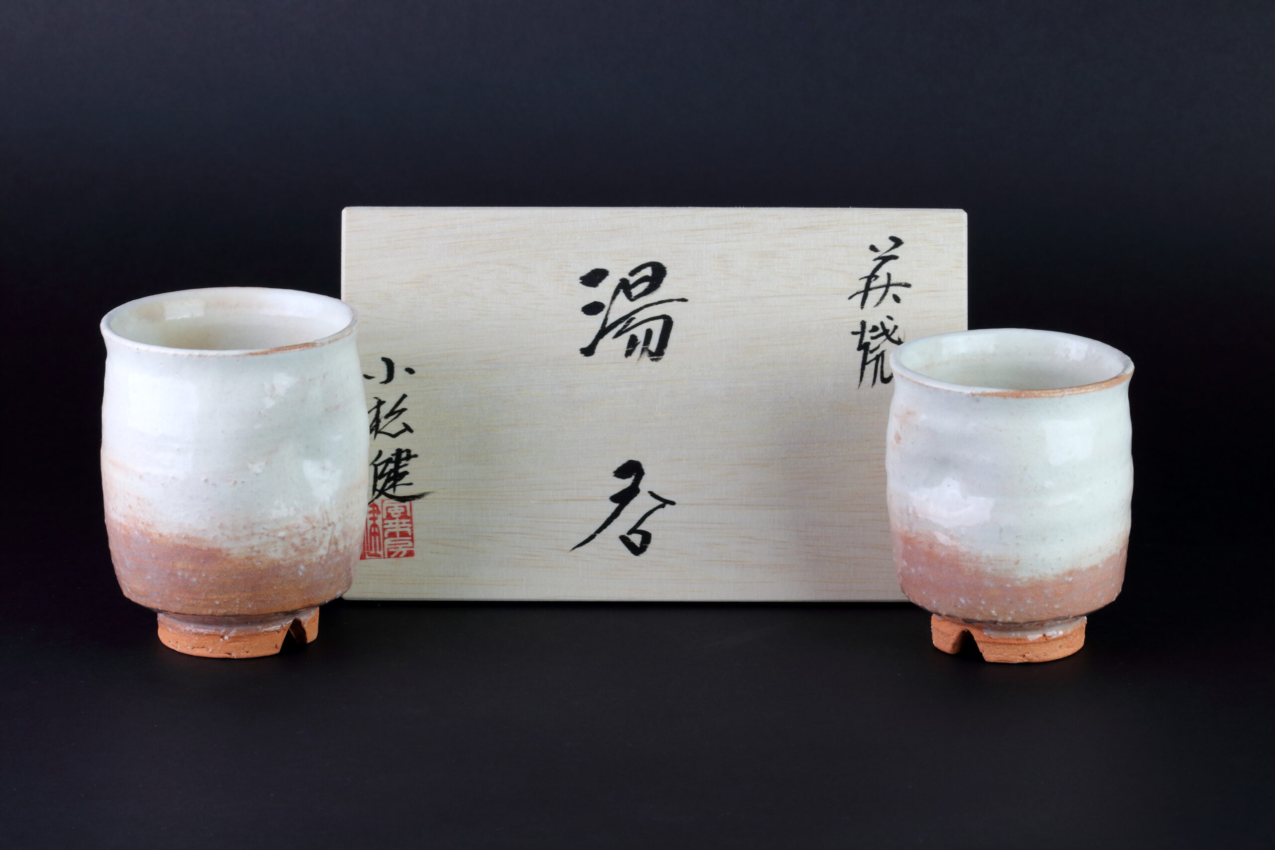 Hagi Yaki-Keramik stammt aus der gleichnamigen Stadt in der Präfekur Yamaguchi und kann auf eine gut 400 Jahre alte Geschichte zurückblicken. Sie wird aus besonders groben Tonerden und viel Sand hergestellt, was man auch bei dieser Keramik sehr schön an der Unterseite sehen kann. Das Außergewöhnliche bei dieser Keramik ist, dass sie erst nach mehrmaligen Gebrauch ihre volle Dichtheit erlangt, die dann natürlich dauerhaft gewährleistet ist. Dies ist ein besonderes Merkmal dieser Keramik und kein Mangel. Ursprünglich stammt diese Art der Keramik aus Korea. Sie gelangte nach Japan durch zwei Brüder, Yi Sukkwang und Yi Kyung, die während der Hideyoshi-Invasion in Korea (1592 – 1597) nach Japan kamen und diese Keramik in Hagi, dem damaligen Gebiet des Mori-Clans, zu ihrer Berühmtheit in ganz Japan verhalfen, die sie bis heute auszeichnet. Auf dem letzten Foto ist das Siegel des Töpfers zu sehen. Das Set wird in der signierten Holzbox geliefert. Der Begriff „Meoto“ bezeichnet übrigens ein Set, bestehend aus einer großen und einer etwas kleineren Tasse. Die gut sichbaren Einbuchtungen oder auch Dellen sind für den Daumen bestimmt und verleihen den Tassen einen besseren Griff.