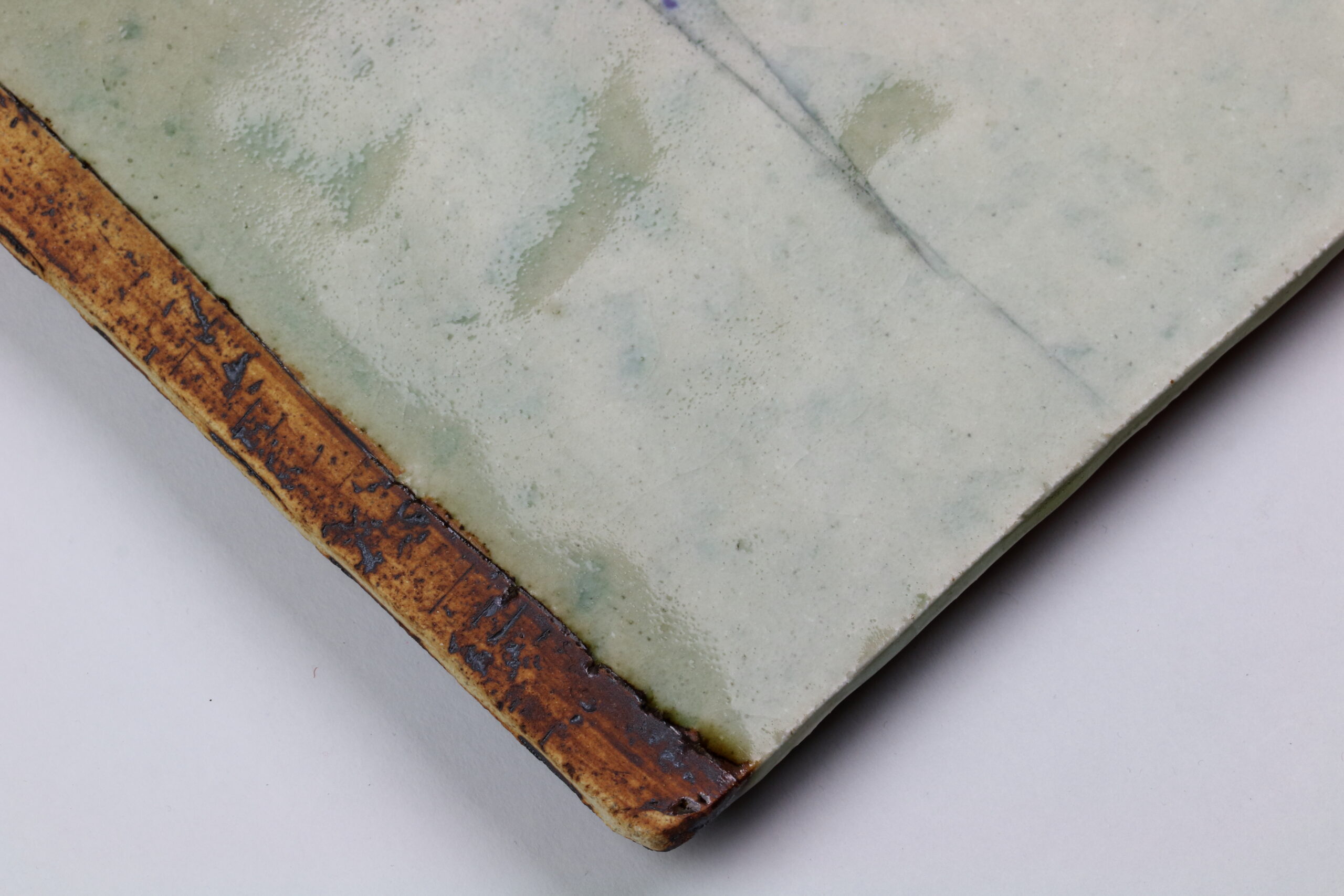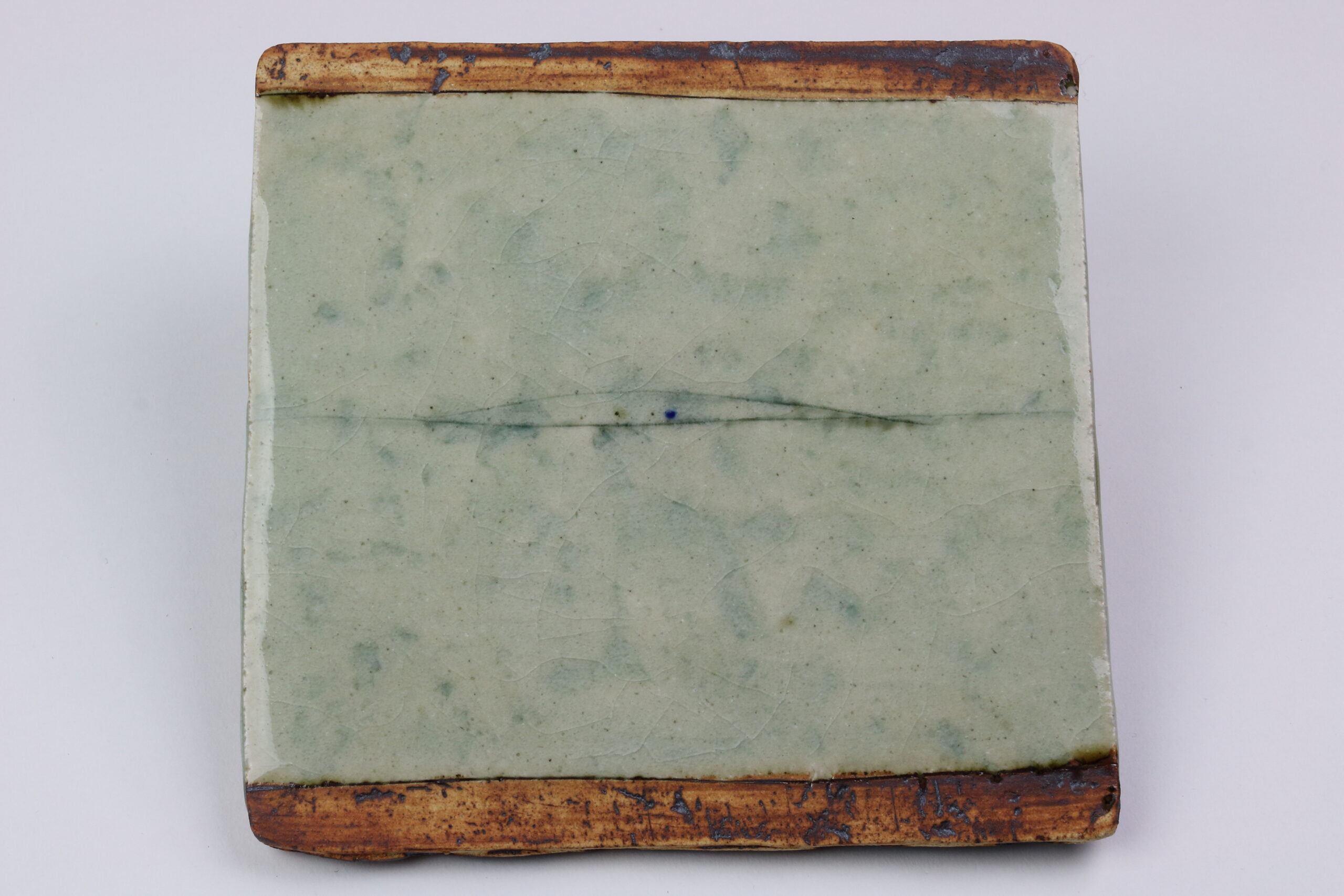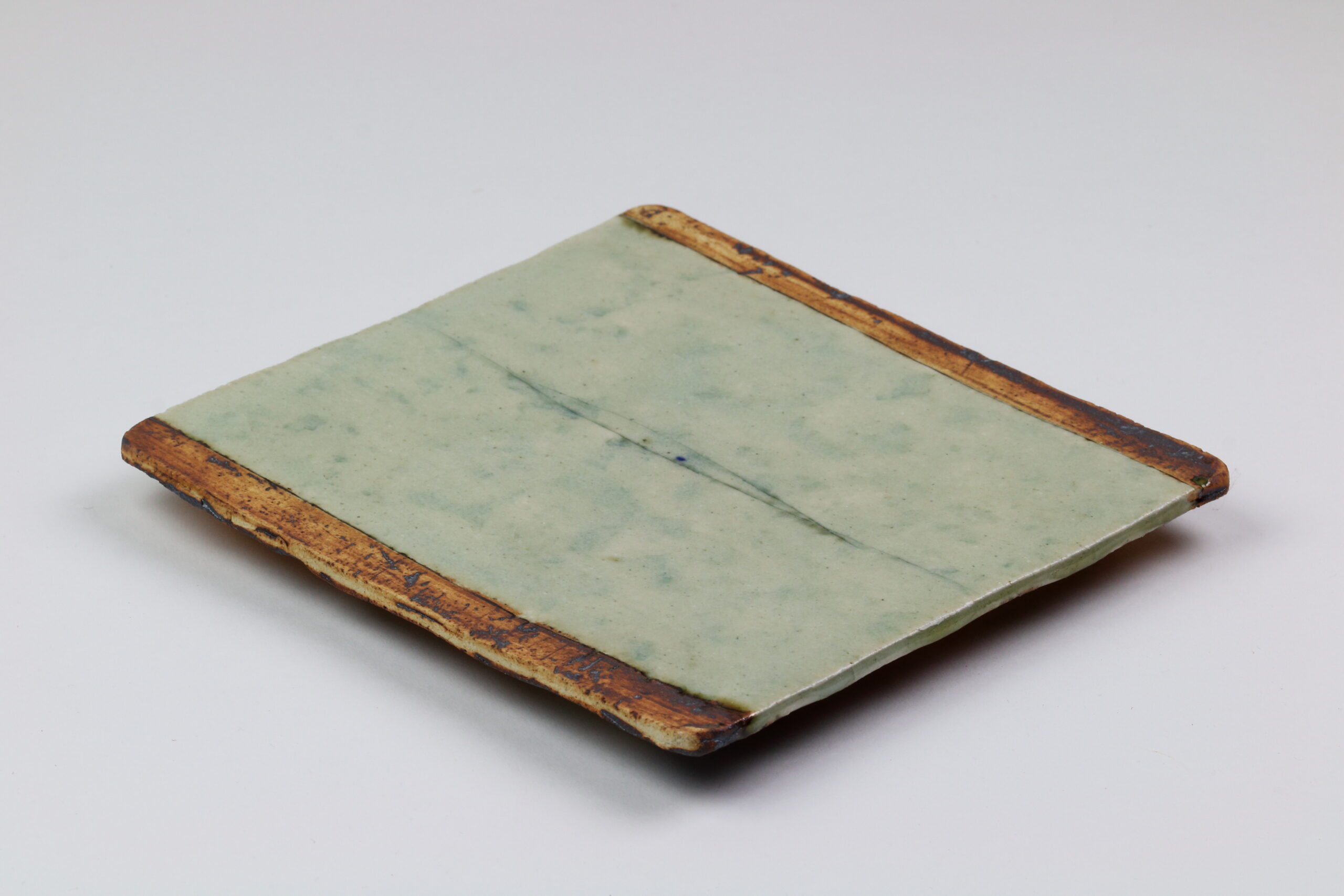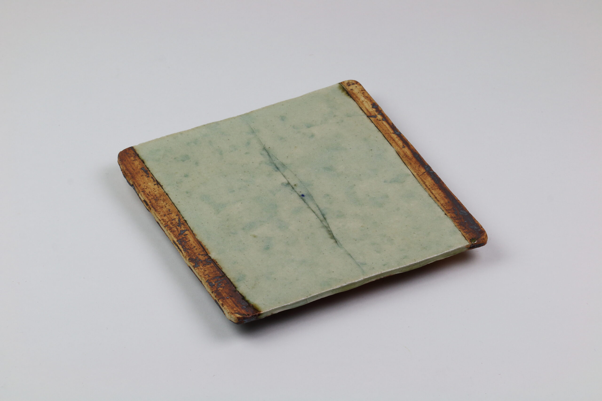 Mino Yaki-Keramik in einzigartigem Desgin! Diese Keramik besteht aus Tatara, einem plattenförmigen Ton. Der innere Teil wurde mit einer leicht uneben gehaltenen Ascheglasur in einem sehr hellen, grünlichen Ton versehen. An zwei Seiten flankiert von unglasierter Keramik in orange- scharlach bis braunfarbenem Ton. Selbst die Unterseite wirkt schon wie ein Kunstwerk. Die Glasur entwickelt mit der Zeit „Risse“, die, je nach Blickwinkel und Lichteinfall, sichtbar und auch nicht sichtbar sind. Dieser Effekt wird gezielt herbeigeführt. Diese Keramik nimmt jedem Tisch, jeder Tafel, die Routine und verleiht diesen das hervorsstechende, außergewöhnliche Etwas! Die Abmessungen betragen 20 cm in der Länge, 20 cm in der Breite sowie 1,5 cm in der Höhe. Das Gewicht beträgt 600g.