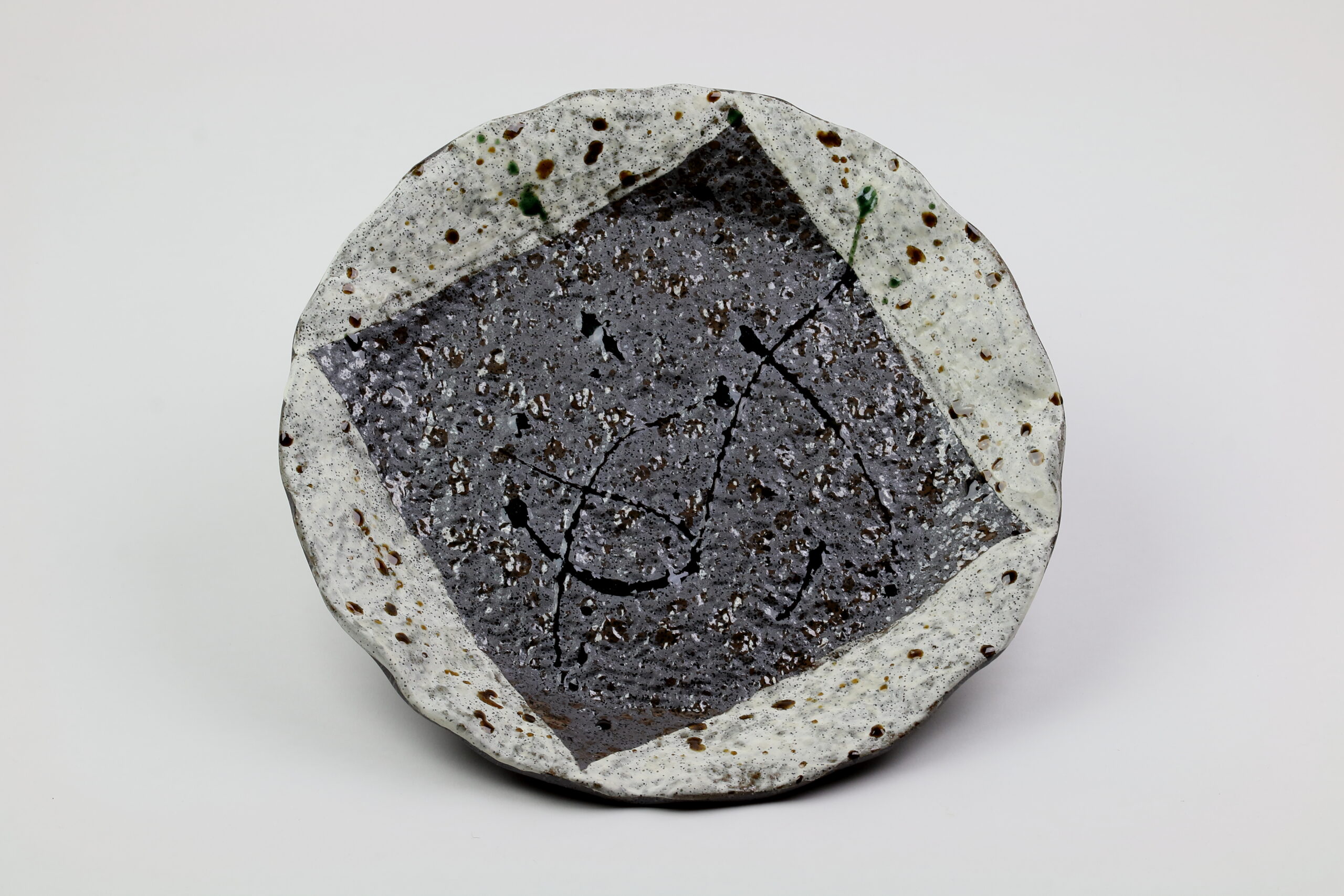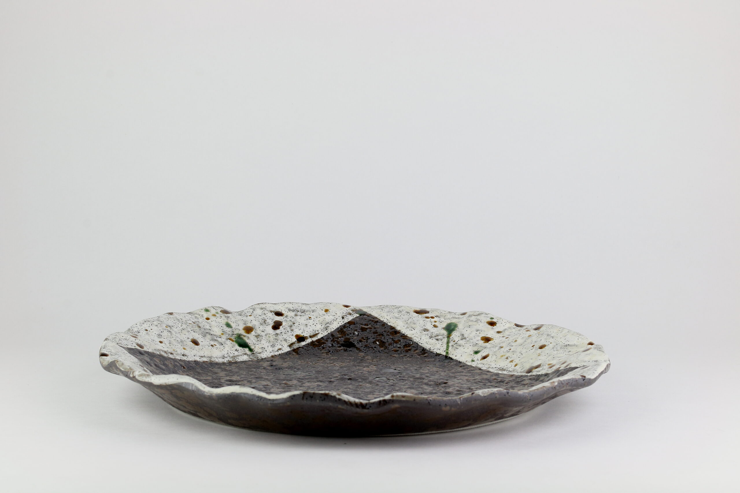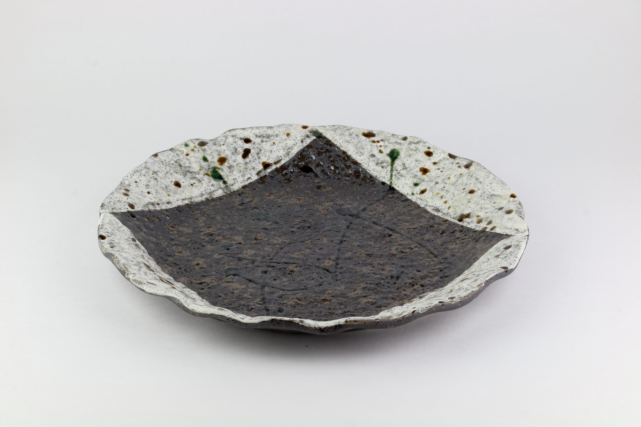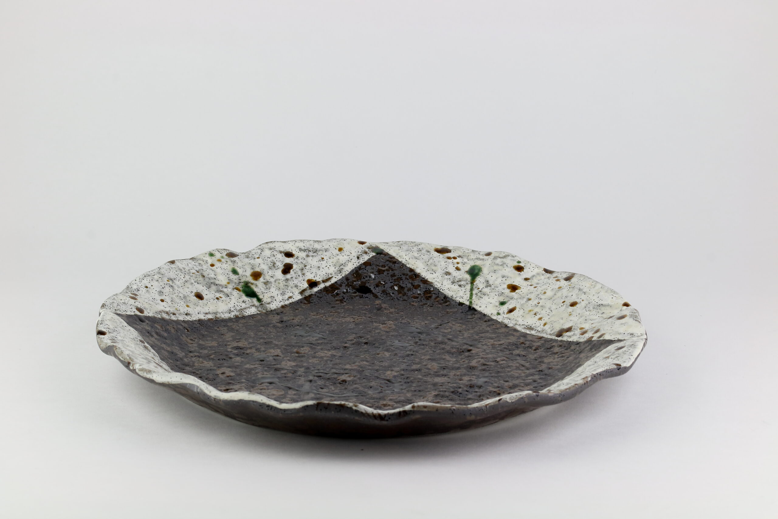 Ebenfalls eine wunderschöne Mino Yaki-Keramik mit zweifarbiger Glasur und einem welligen Rand. Diese Keramik eignet sich für den Mittagstisch für Gerichte aller Art. Sie können jedoch Ihrer Phantasie freien Lauf lassen und sie zum Beispiel auch als Obstablage verwenden. Die Abmessungen betragen 29 cm im Durchmesser und 3 cm in der Höhe, das Gewicht beträgt 1160g.