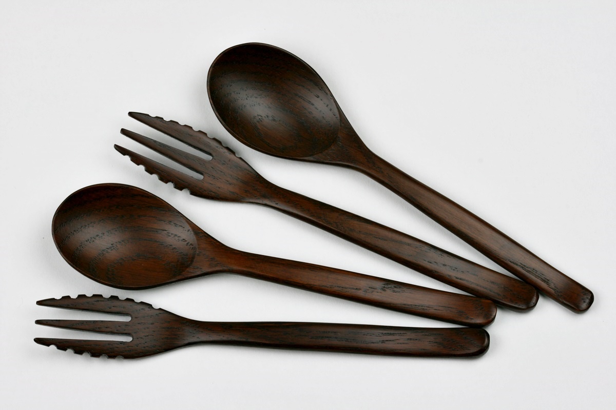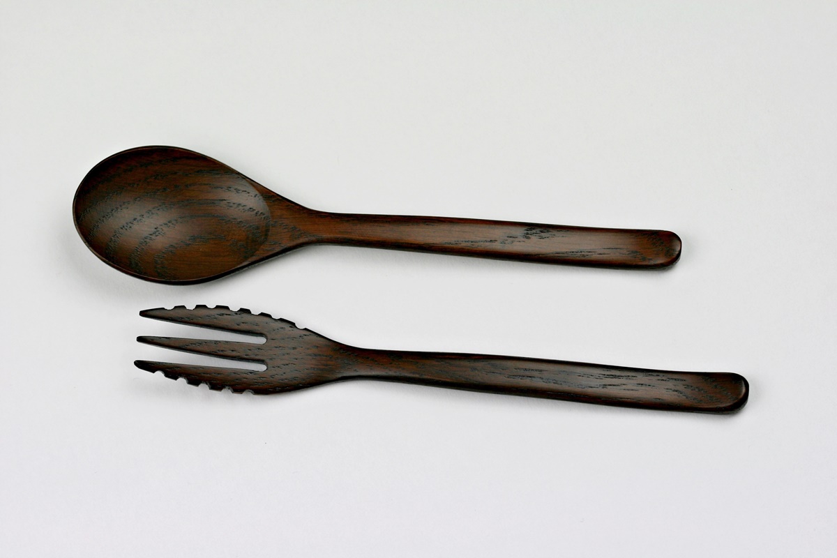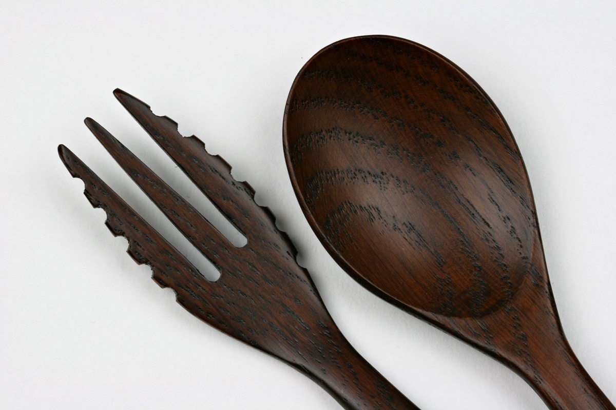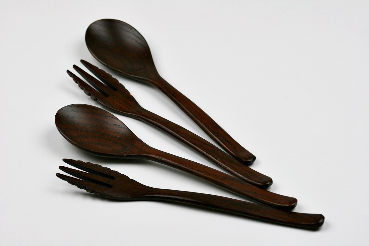 Sehr schönes Pastabesteck aus Eichenholz. Die Maserung ist auf den Bildern ebenfalls schön zu erkennen. Wie erwähnt wurde dieses Besteck für Pastagerichte, speziell Spaghetti, gefertigt. Erkennen kann man das besonders gut an den Gabeln. Die Länge beträgt jeweils 18,5 cm, das Gewicht ca. 10 Gramm. Nicht geeignet für Mikrowellenherde und Geschirrspülmaschinen. Set-Preis.