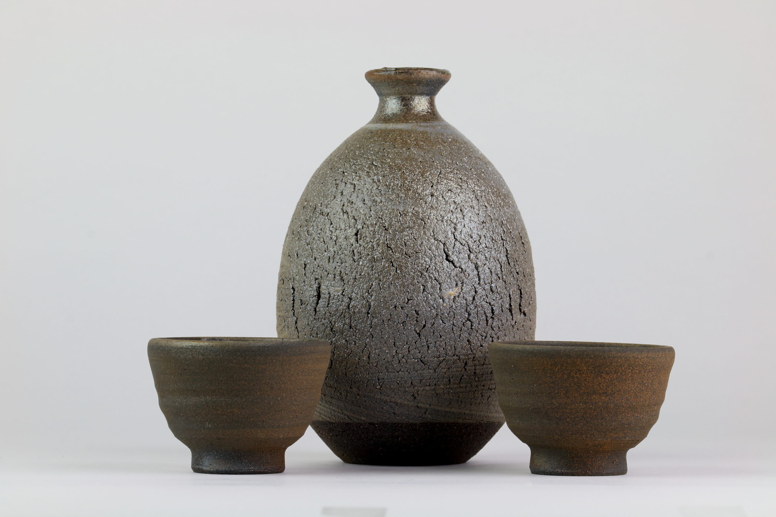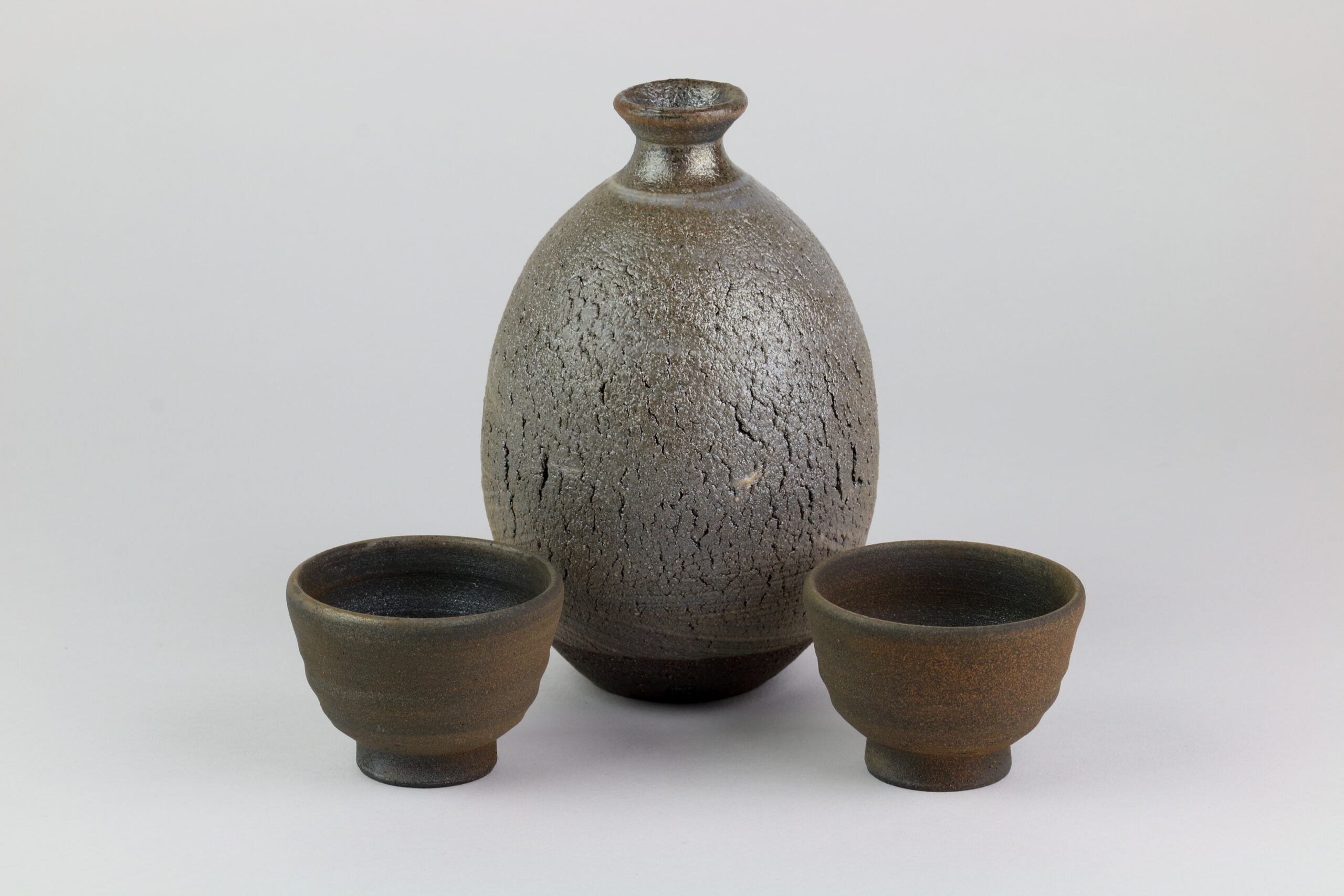 Ein Schmuckstück unter den Sake-Keramiken. Die Glasur der Sake-Flasche wurde teils glänzend, teils stumpf gehalten. Die Becher wurden komplett stumpf gestaltet. Ein außergewöhnlich schönes Keramik-Set. Auf den jeweils letzten Fotos sehen Sie das Siegel des Designers. Die Abmessungen der Flasche betragen 10cm im Durchmesser und 15cm in der Höhe. Das Gewicht beträgt 232g. Die Abmessungen der Becher betragen 6,7cm im Durchmesser und 4,7cm in der Höhe. Das Gewicht beträgt 60g.