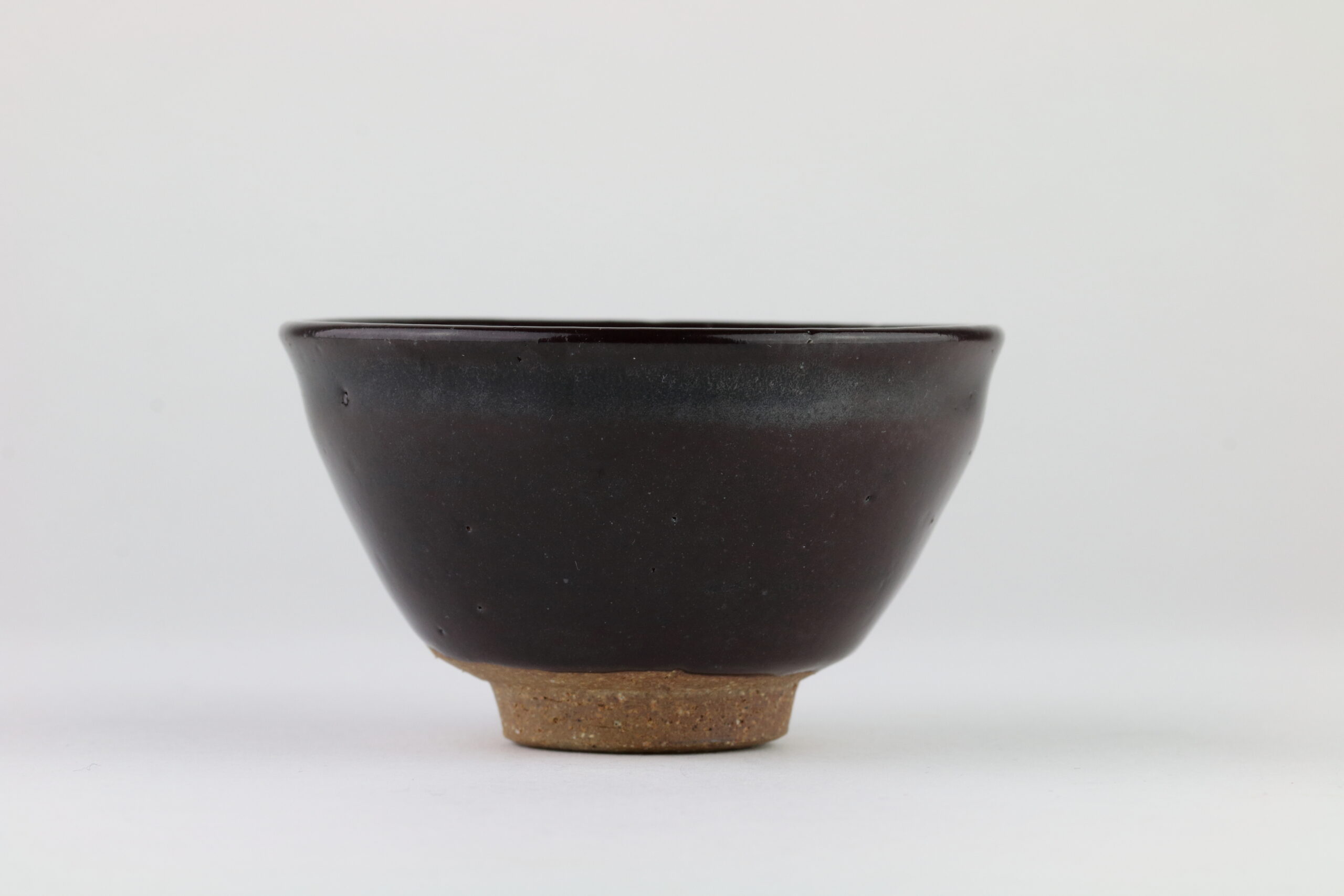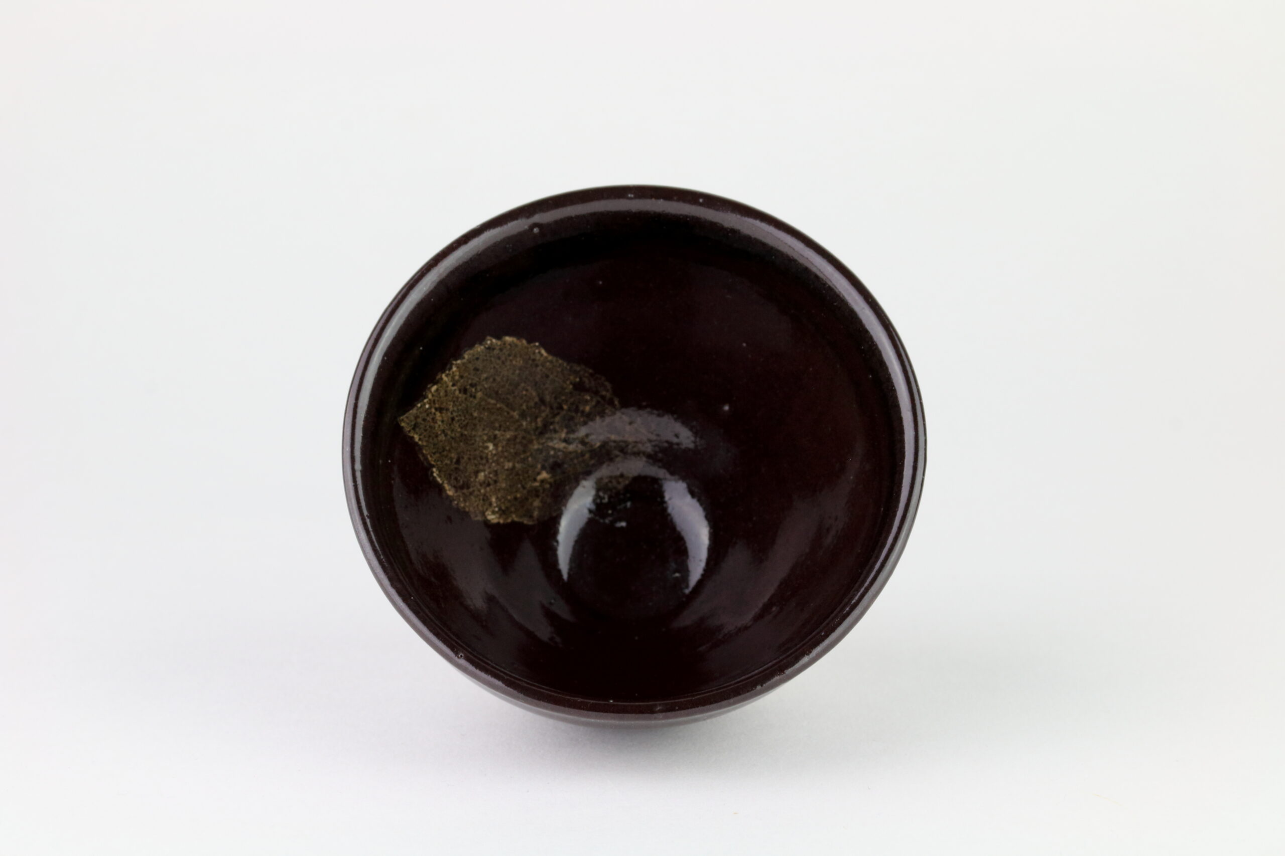 Tenmoku Sake Tasse -Yuteki-: Die Bezeichnung „Yuteki Tenmoku“ ist dem Aussehen dieser Glasur geschuldet. Das Aussehen erinnert an Ölflecken, die in einer Jadefarbe leuchten. Besonders beliebt war diese Technik in der Zeit der „streitenden Staaten“. Die Abmessungen dieser Sake-Tasse betragen 4cm in der Höhe und 8cm im Durchmesser. Das Gewicht 105g.