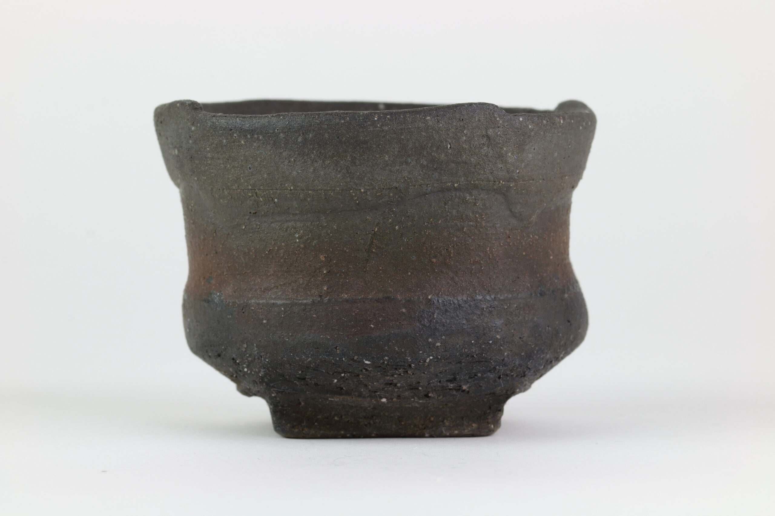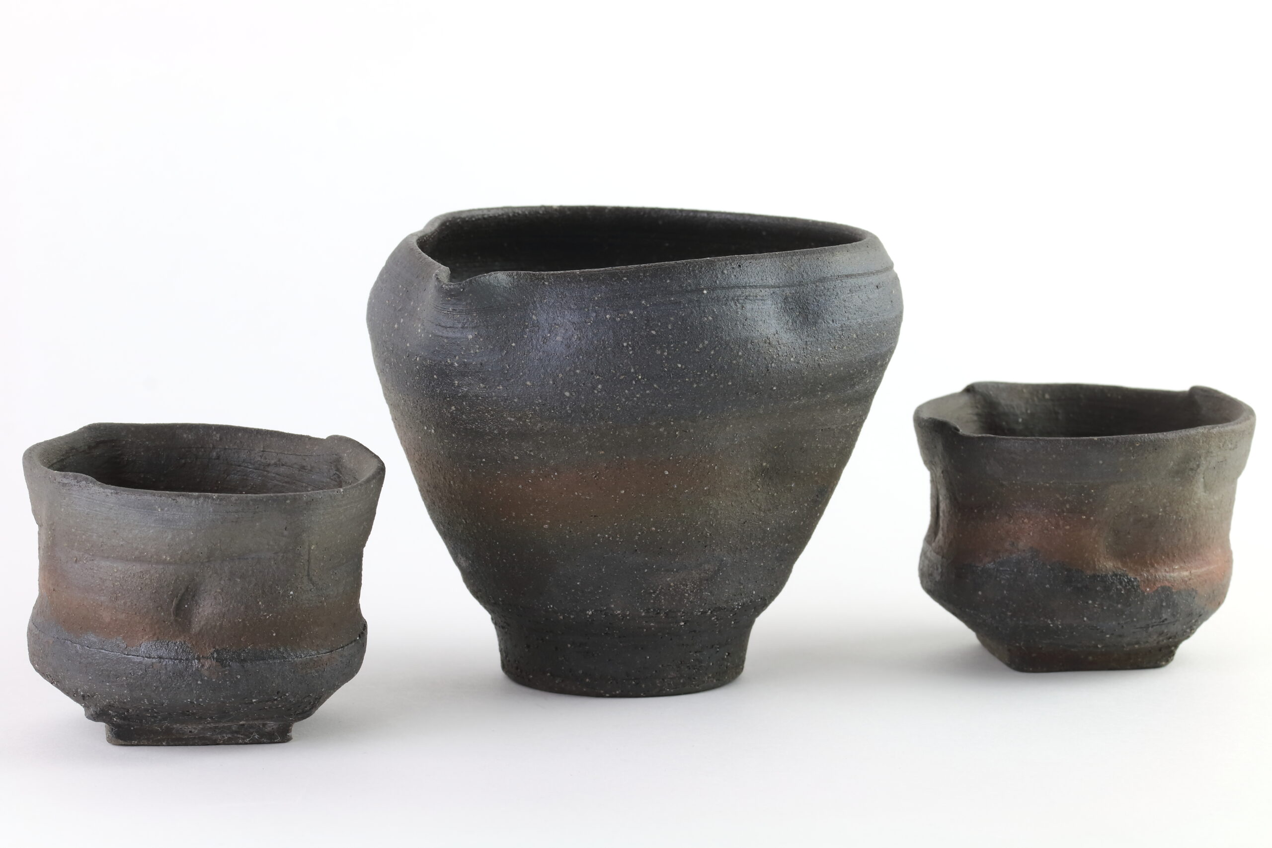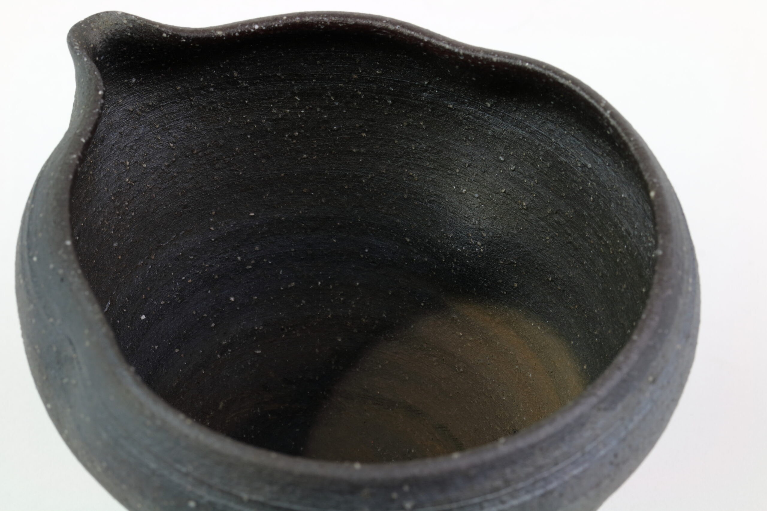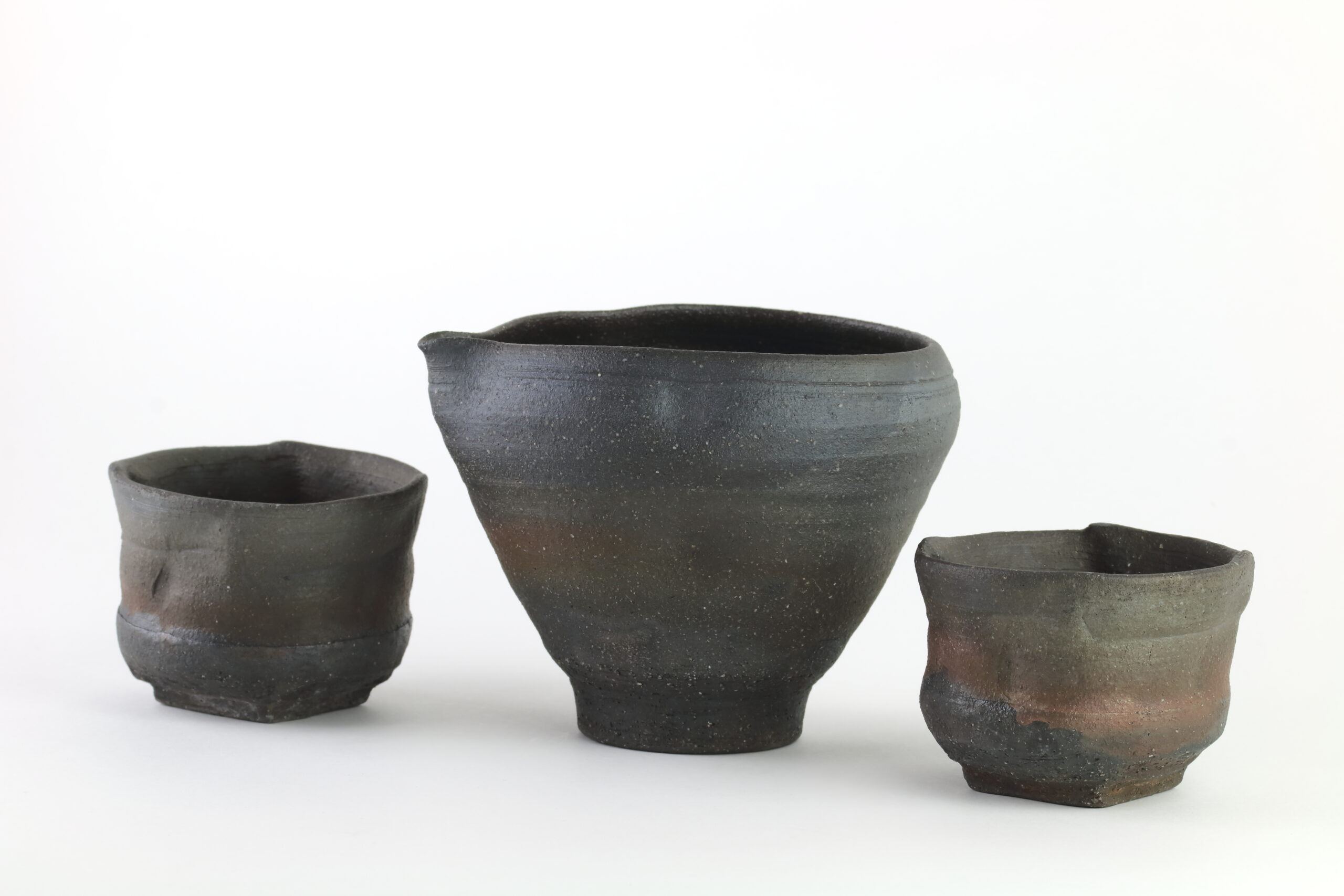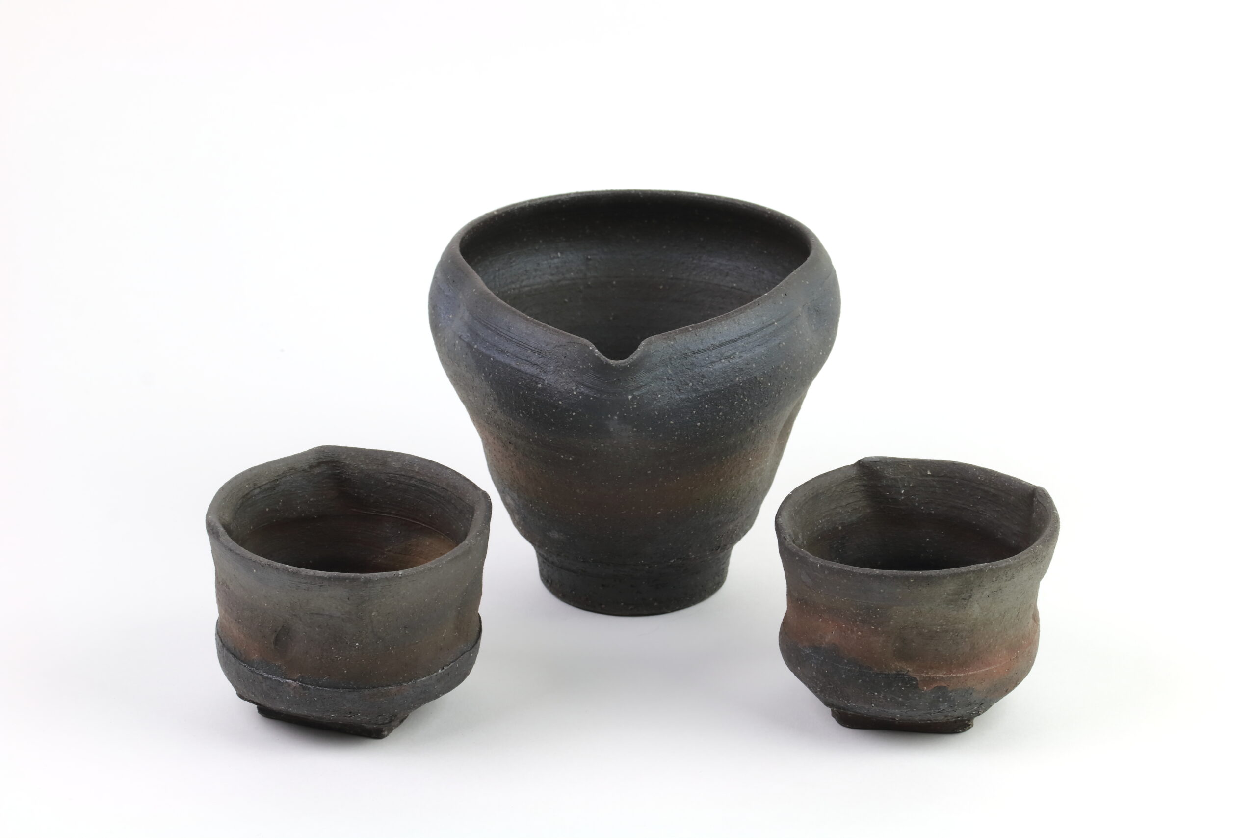 Einzigartiges Sake-Set der Hechimon-Serie. Der Begriff „Hechimon“ steht für handgefertigte Einzelstücke, die die natürlich Schönheit und Unvollkommenheit hervorheben. Der Begriff „Katakuchi“ bezeichnet den einseitigen Ausguss. Bei der Sake-Kanne sind links und rechts deutliche „Einbuchtungen“ oder auch „Dellen“ zu sehen. Je nachdem, ob man die Sake-Kanne in der linken oder rechten Hand hält, entsprechend den Daumen und Zeigefinger platziert, gewährleisten diese Dellen einen sicheren Griff. Diese Keramik zeichnet sich durch eine raue „Rust-Ibushi“-Glasur aus, die ihr eine raue, dunkel oxidierte Oberfläche mit subtilen Erdtönen verleiht.