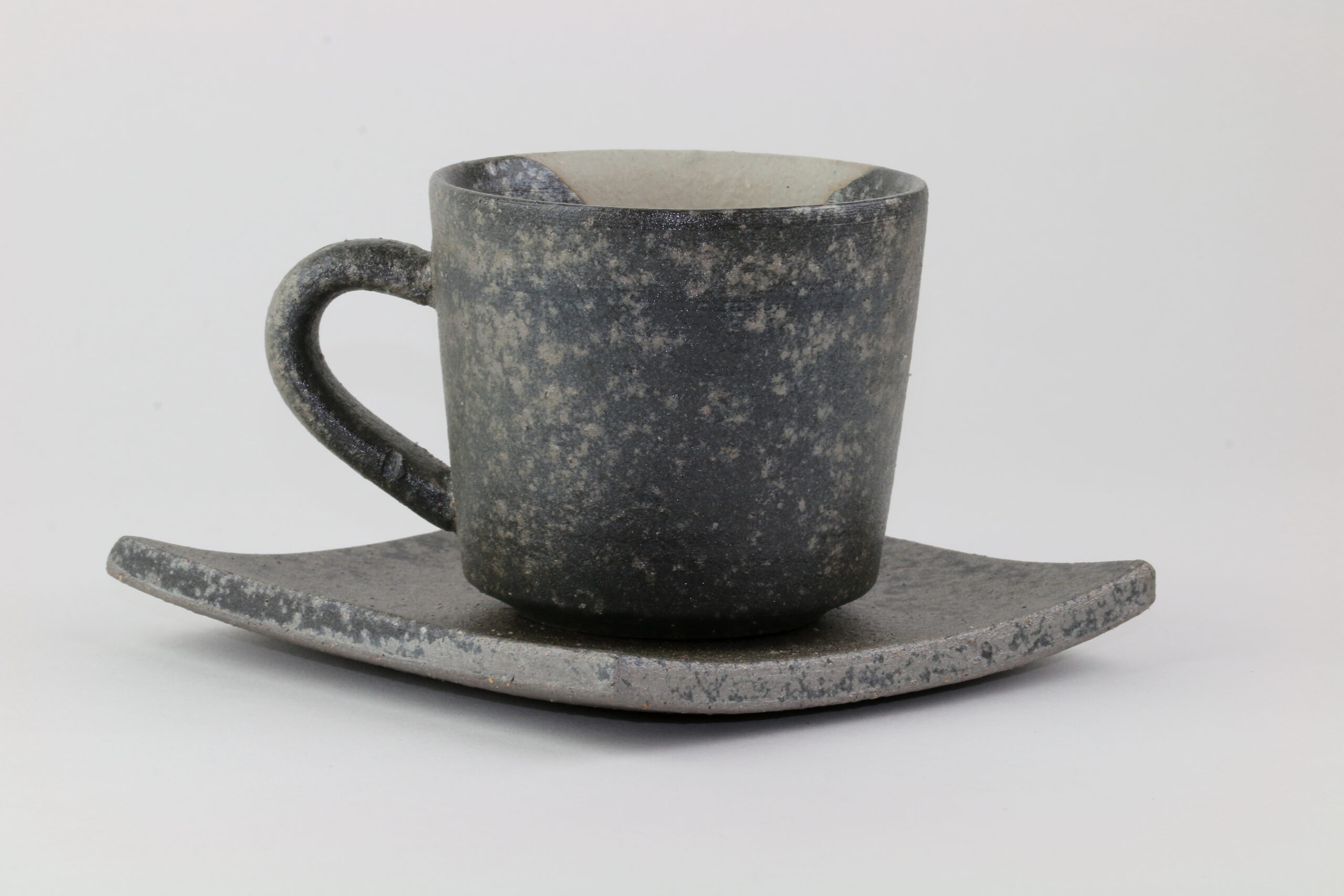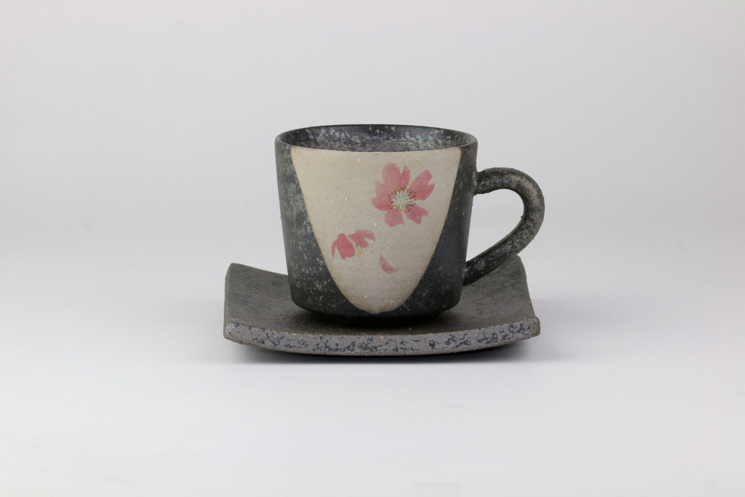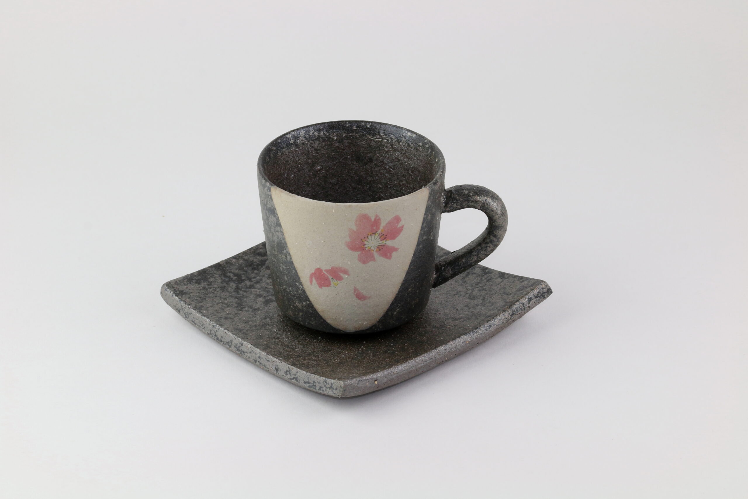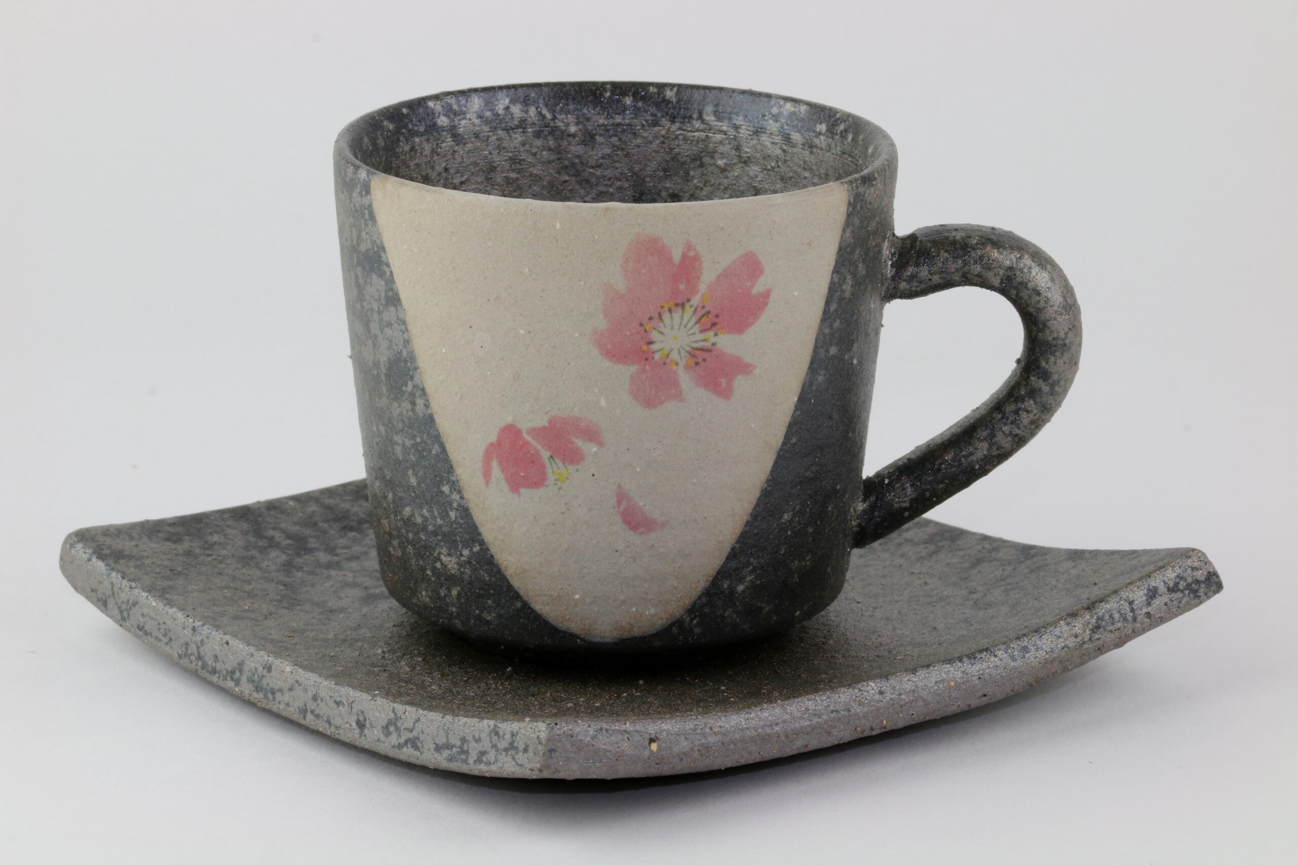 Ebenfalls aus Shigaraki stammt diese schöne Kaffeetasse mit der Bezeichnung „Momosakura“, was soviel wie „Pfirsichblüte“ bedeutet. Es handelt sich hier um unglasierte Keramik. Benutzen Sie bitte die Lupenfunktion um die Details und Schönheit dieser Keramik besser in Augenschein nehmen zu können. Die Abmessungen der Untertasse betragen 12,5cm x 12,5cm, die Höhe beträgt 2cm. Die Abmessungen der Tasse betragen 7,5cm in der Höhe und, den Griff einbezogen, 11cm in der Breite. Das Volumen beträgt ca. 180ml, das Gewicht dieser Keramik beträgt 488g.