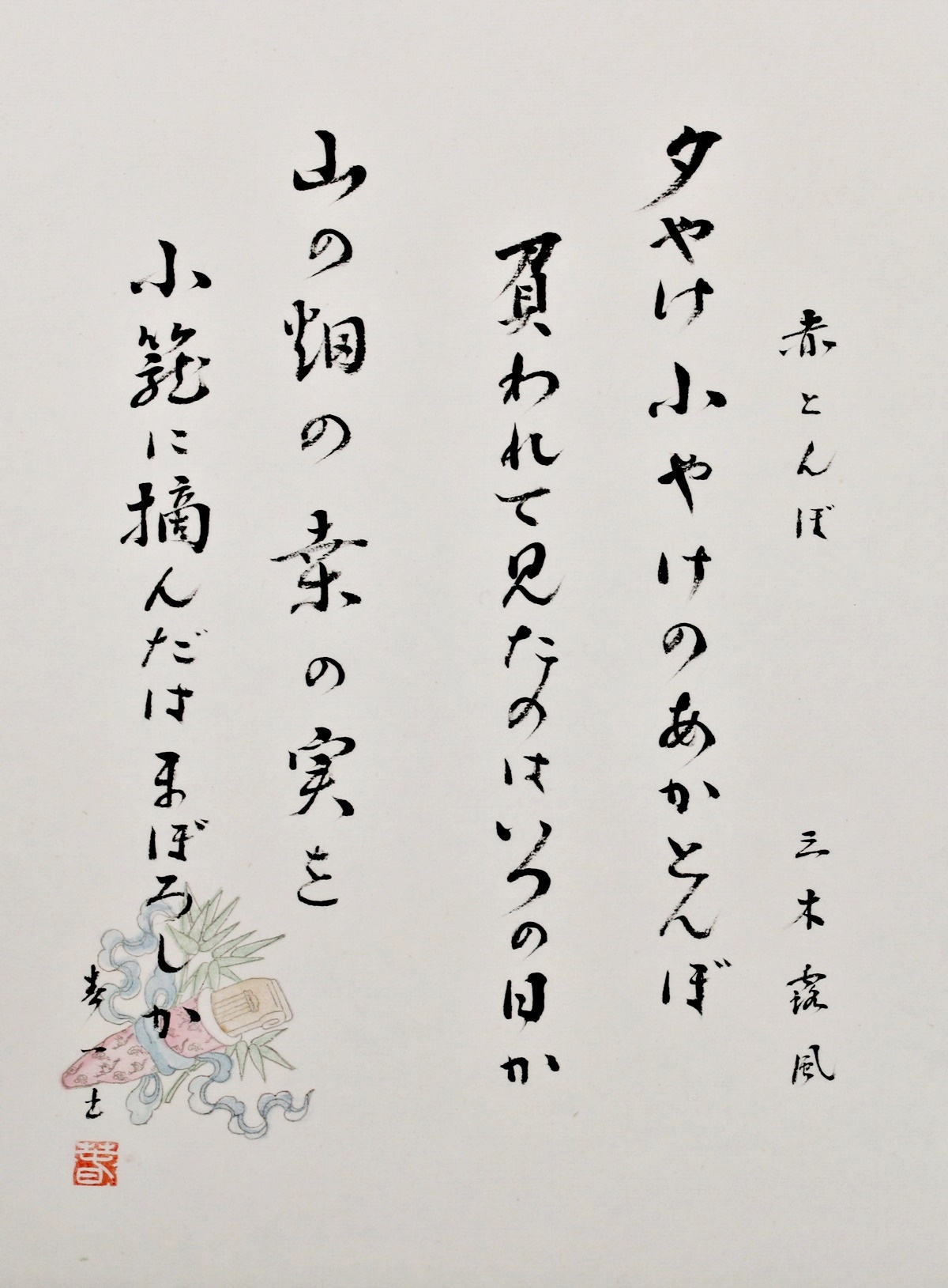 Bei diesem Shodo handelt es sich um ein Gedicht mit dem Titel: -Rote Libelle- von Miki Rofu. Geschrieben wurde dieses Shodo im Sosho-Stil.