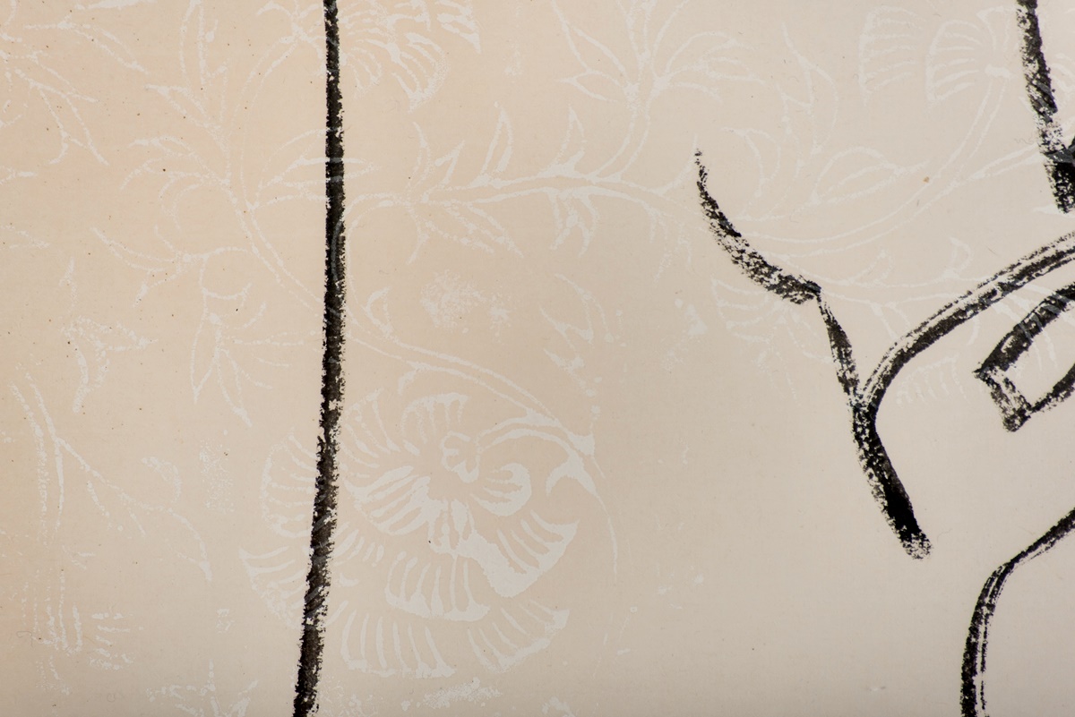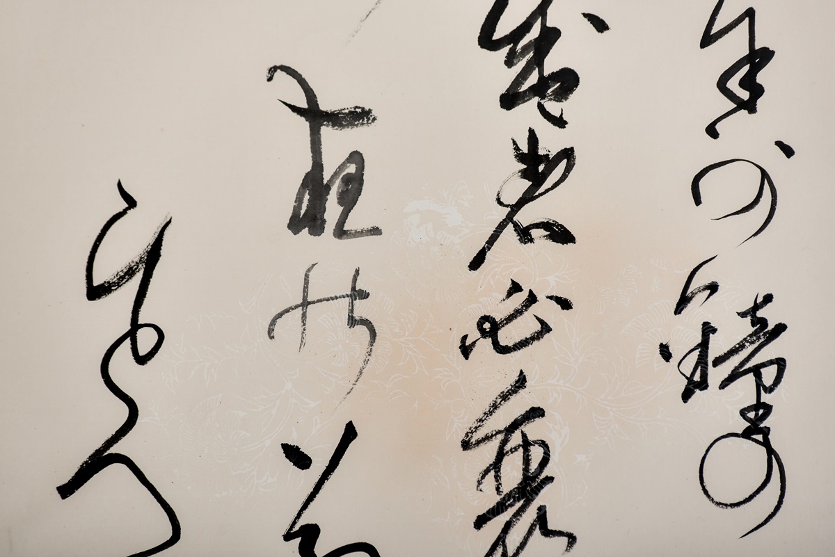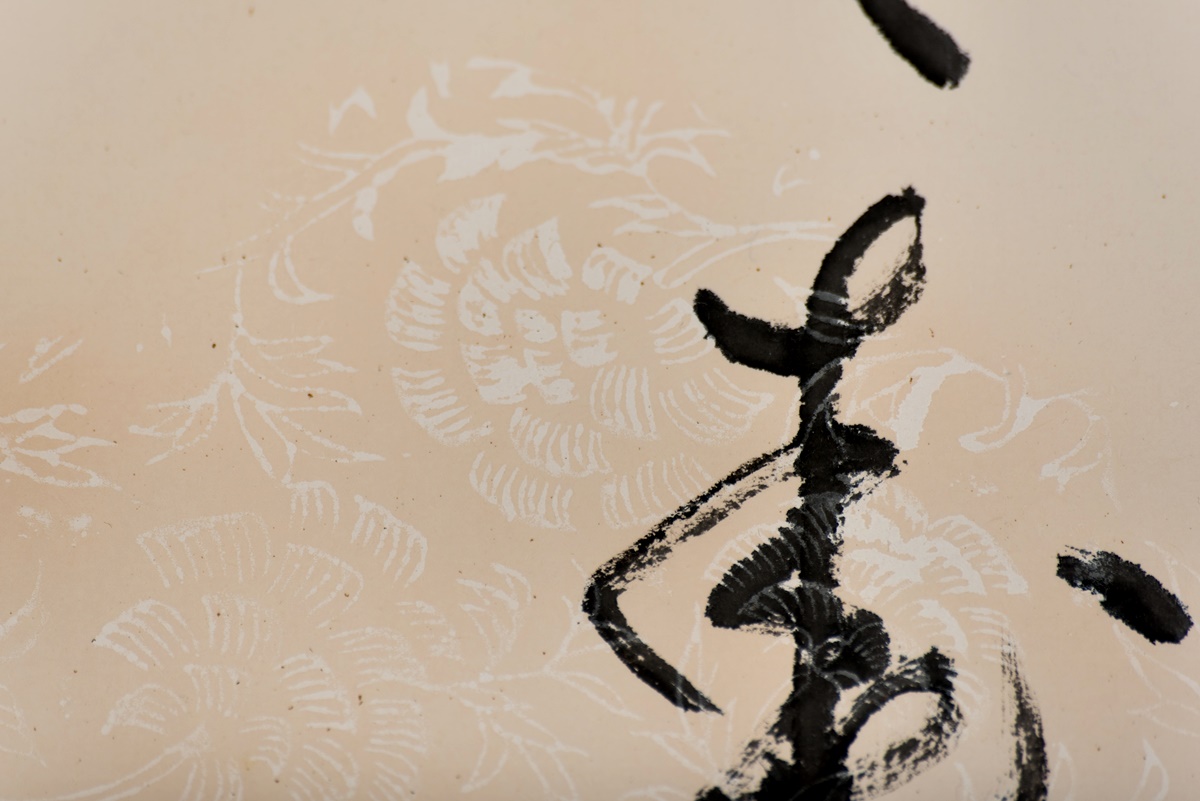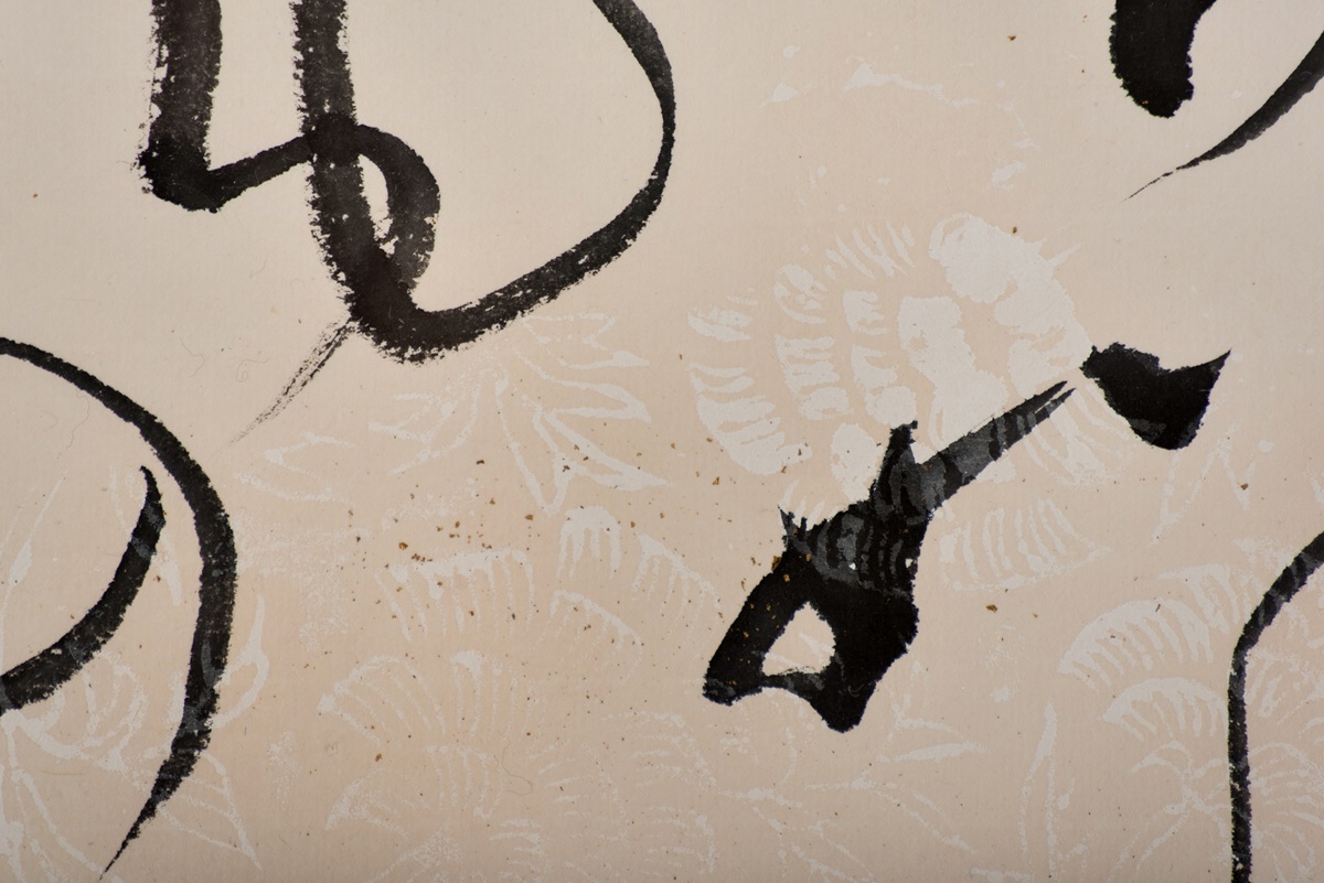 Dieses Shodo wurde aus doppelt gefasstem Japan-Papier gefertigt. In das Papier wurden Strukturen eingearbeitet, die, je nach Blickwinkel, sichtbar oder nicht sichtbar sind. Auf den kleineren Bildern kann man mit bloßem Auge den Goldstaub erkennen, der ebenfalls in das Papier eingearbeitet wurde.