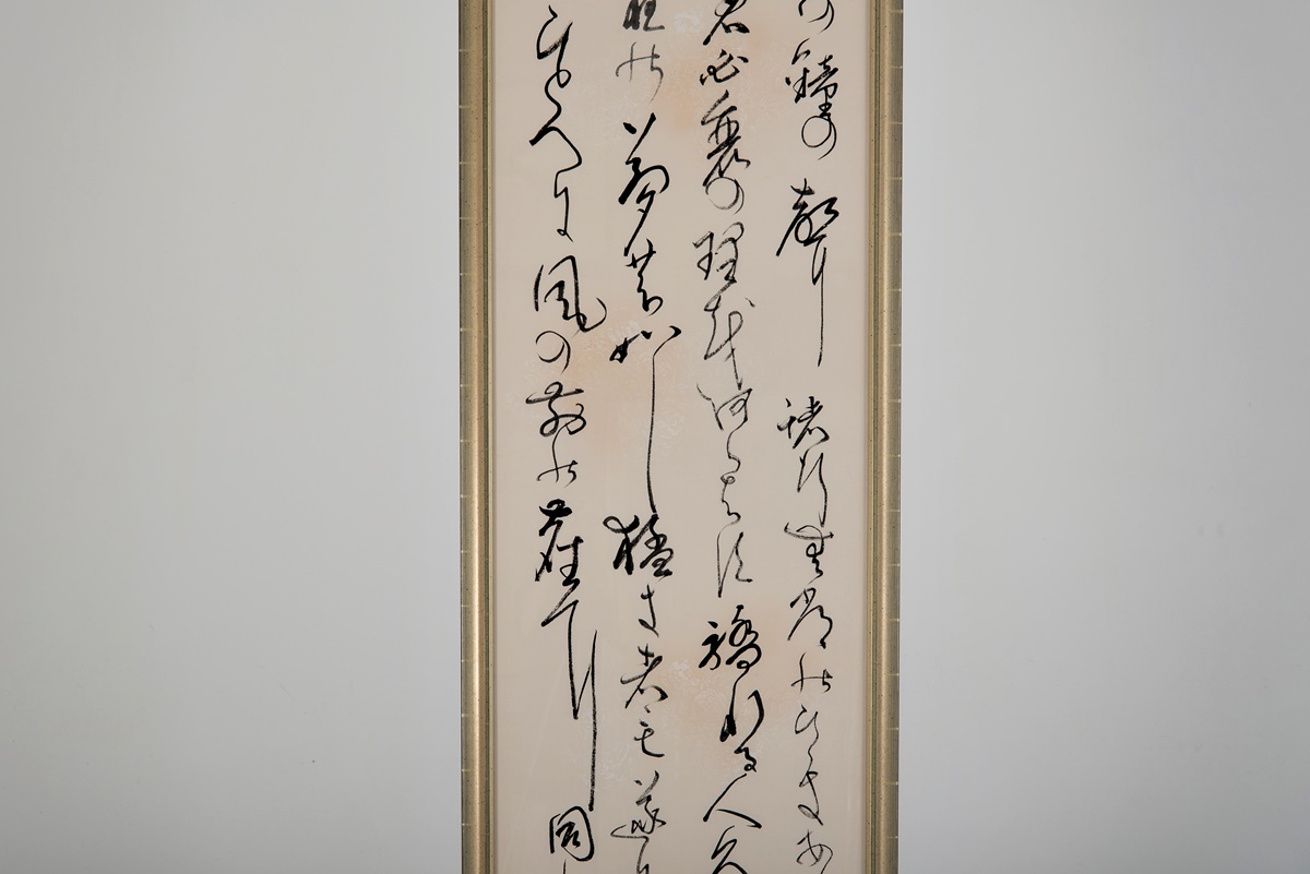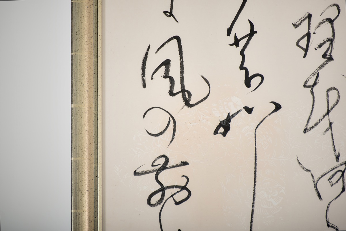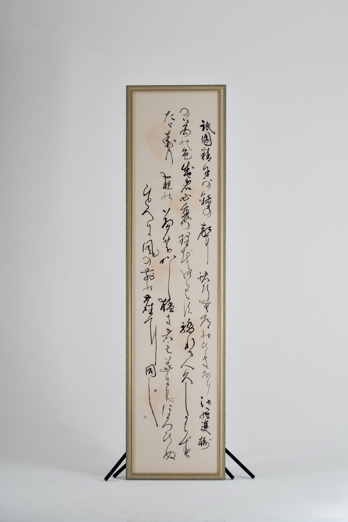 Dieses Shodo wurde mit einem Rahmen (Holzleiste/Silberpatina) und drei Millimeter Acrylglas versehen. Acrylglas absorbiert die UV-Strahlung zu 97 – 99%. Trotzdem ist es NICHT ratsam, dieses Shodo direkter Sonnenstrahlung auszusetzen.