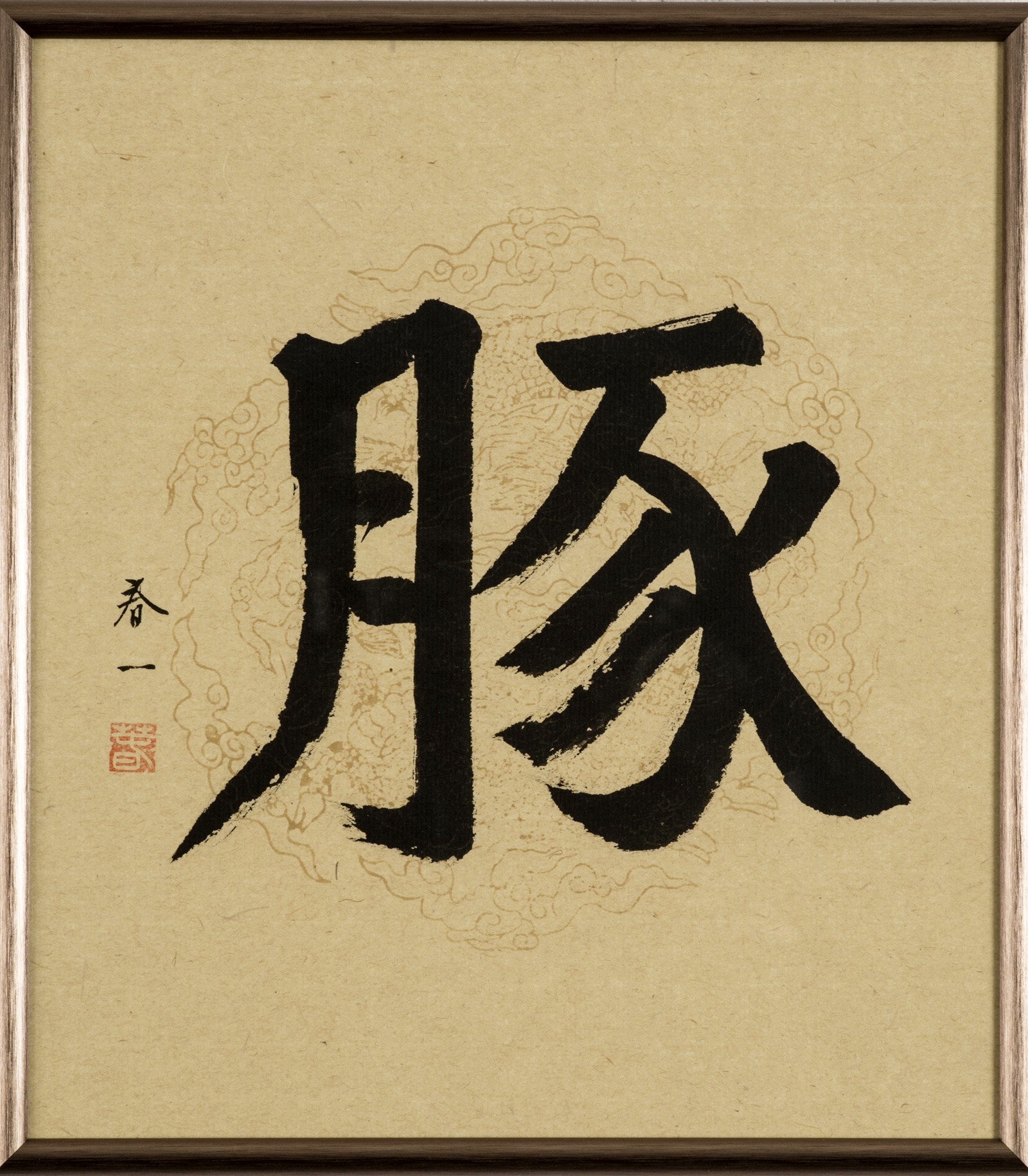Shodo „Schwein“. Shodo in der Abmessungen (Rahmengröße) 24,5 cm x 27,5 cm. Aluminium-Rahmen, hinter Glas. Bitte setzen Sie dieses Shodo keiner direkten Sonneneinstrahlung aus.