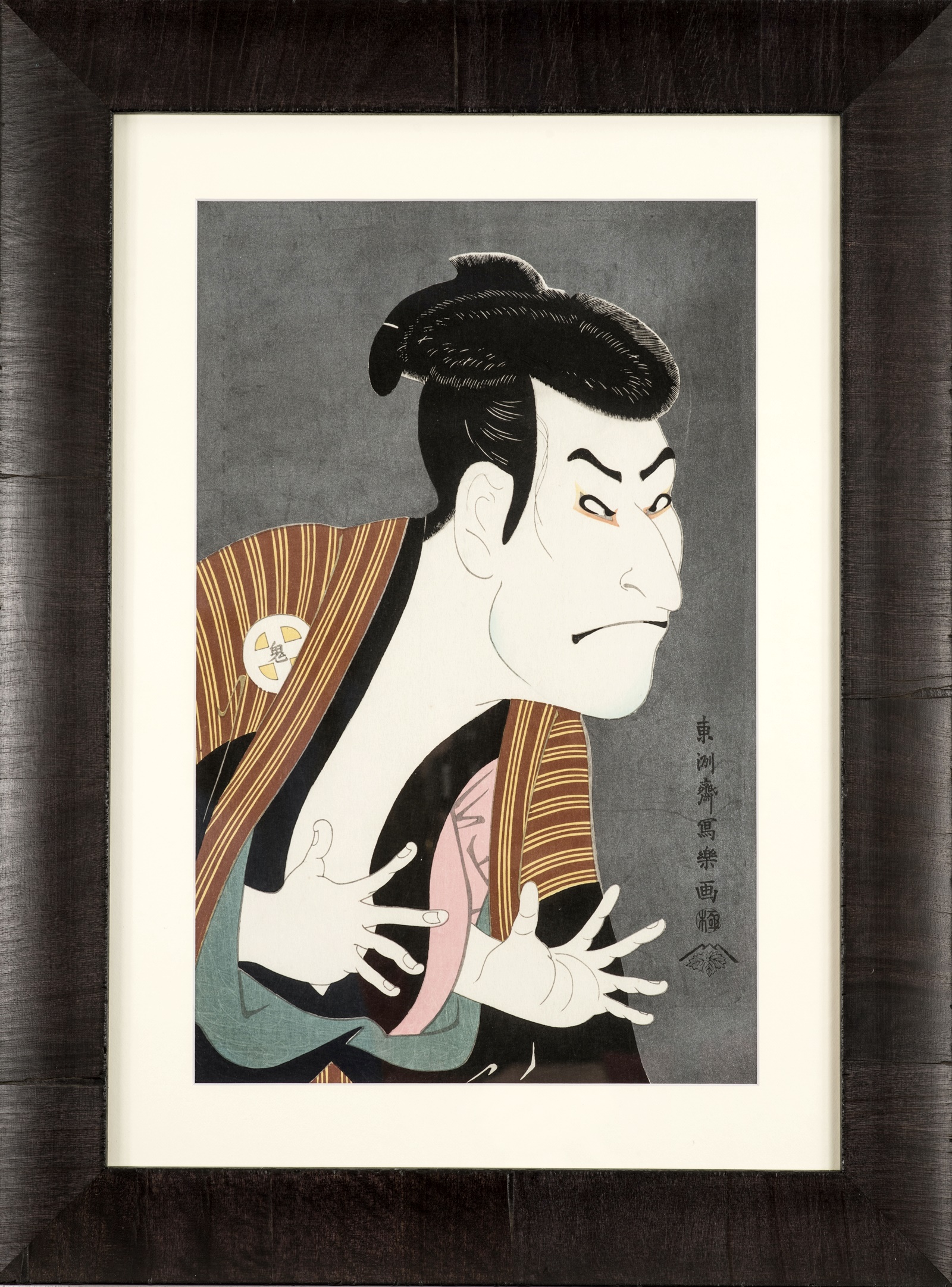 Hier ist der Schauspieler Otani Oniji der 3. in der Rolle des Yakko Edobe zu sehen. Dieses Bild wurde ebenfalls mit Mica-Pulver bearbeitet, vor dessen Hintergrund der Schauspieler vorteilhafter erscheint. In dieser Szene spielt er die böse Person Yakko Edobe, die zusammen mit anderen bösen Personen Geld von Händlern einfordert.