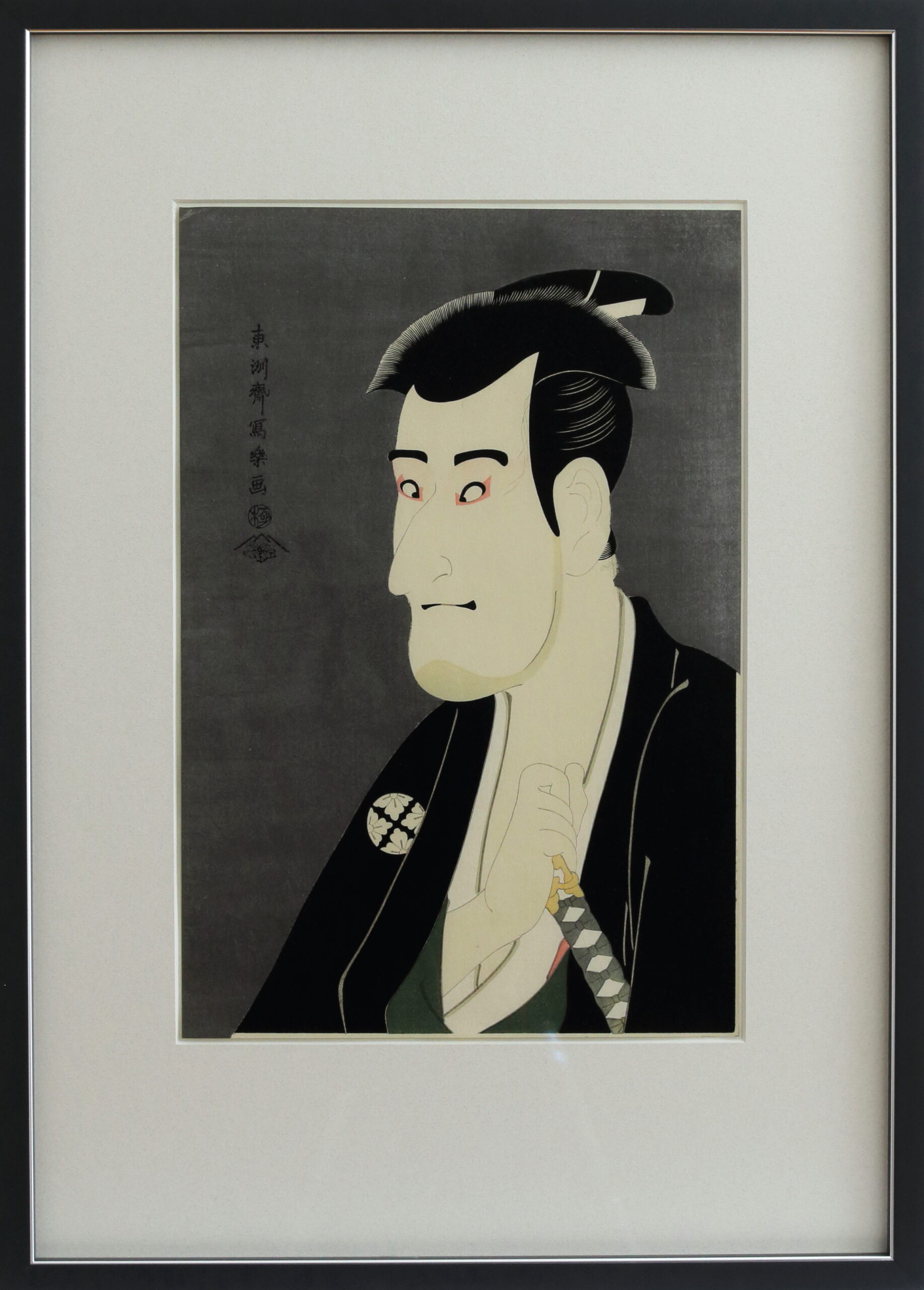 Sharakus Zeichnung von Schauspielern hat außergewöhnliche Kraft. Dieser Druck stellt Komazo in der Rolle des Schurken in dem Stück Kataki-uchi Noriai-banashi dar. Sein Gesichtsausdruck ist männlich, kraftvoll und bösartig. Beachten Sie, wie die markante Nase des Schauspielers knapp hinter der linken Gesichtslinie liegt. Der Mund ist mit einem einzigen schwarzen Strich gezeichnet und die runden Augen sind mit runden Bändern aus rotem Make-up verziert.