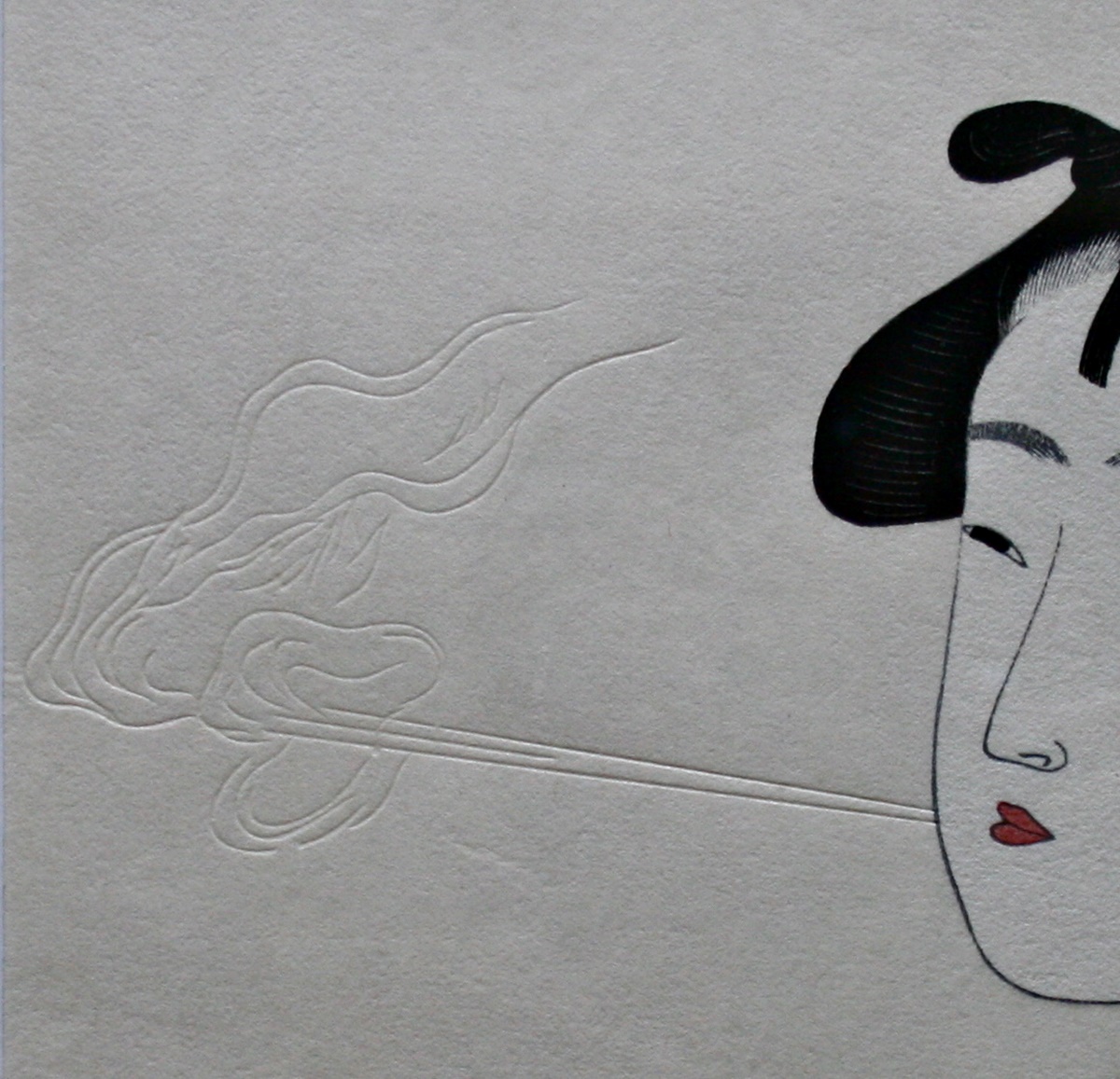 Die Frau, die Rauch aus einer Pfeife ausatmet. Aus der Serie: Zehn Klassen der Frauenphysiognomie. Die Besonderheit bei diesem Bild: Der Rauch, den die Dame ausbläst, wurde in das Papier eingearbeitet, wie auf dem kleinen Bildausschnitt sehr gut zu erkennen ist.