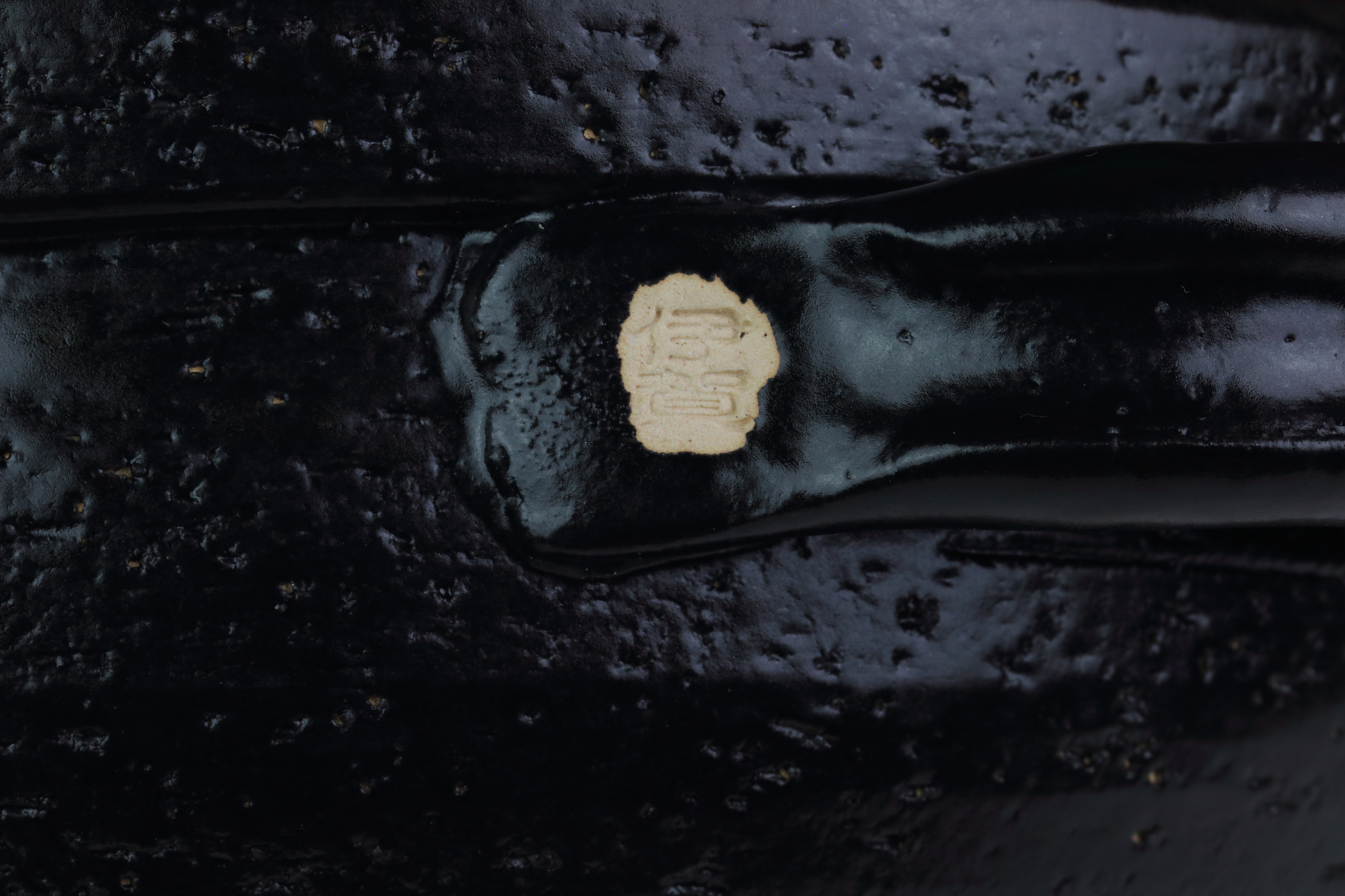 Ein Iga-Keramik-Set bestehend aus einem Keramik-Topf, einem Hashi-Set und einem Kochlöffel hergestellt aus Birne. Diese Keramiktöpfe sind in Japan sehr beliebt. Besonders oft werden sie im Winter und hier für gesellige Abendessen in der Familie und/oder im Freundeskreis verwendet. Der Topf wird dabei in der Mitte platziert, der Inhalt des Topfes ist ausreichend für vier Personden. Bei dieser Keramik wurde der Deckel mit einem rotumrandeten Gesicht, dem sogenannten „Daruma“, verziert. Seit der Edo-Zeit wird dieser Daruma als Glücksbringer verehrt, zu dem man auch für den Erhalt der Gesundheit und die Sicherheit Familie betet. Die ebenfalls auf den Deckel ersichtlichen Kanji bedeuten im übertragenen Sinn soviel wie -Daruma´s Haus-. Auf den letzten beiden Fotos sehen Sie das Siegel der Töpferei, einnal auf der Unterseite des Deckels und einmal am Griff des Topfes.
