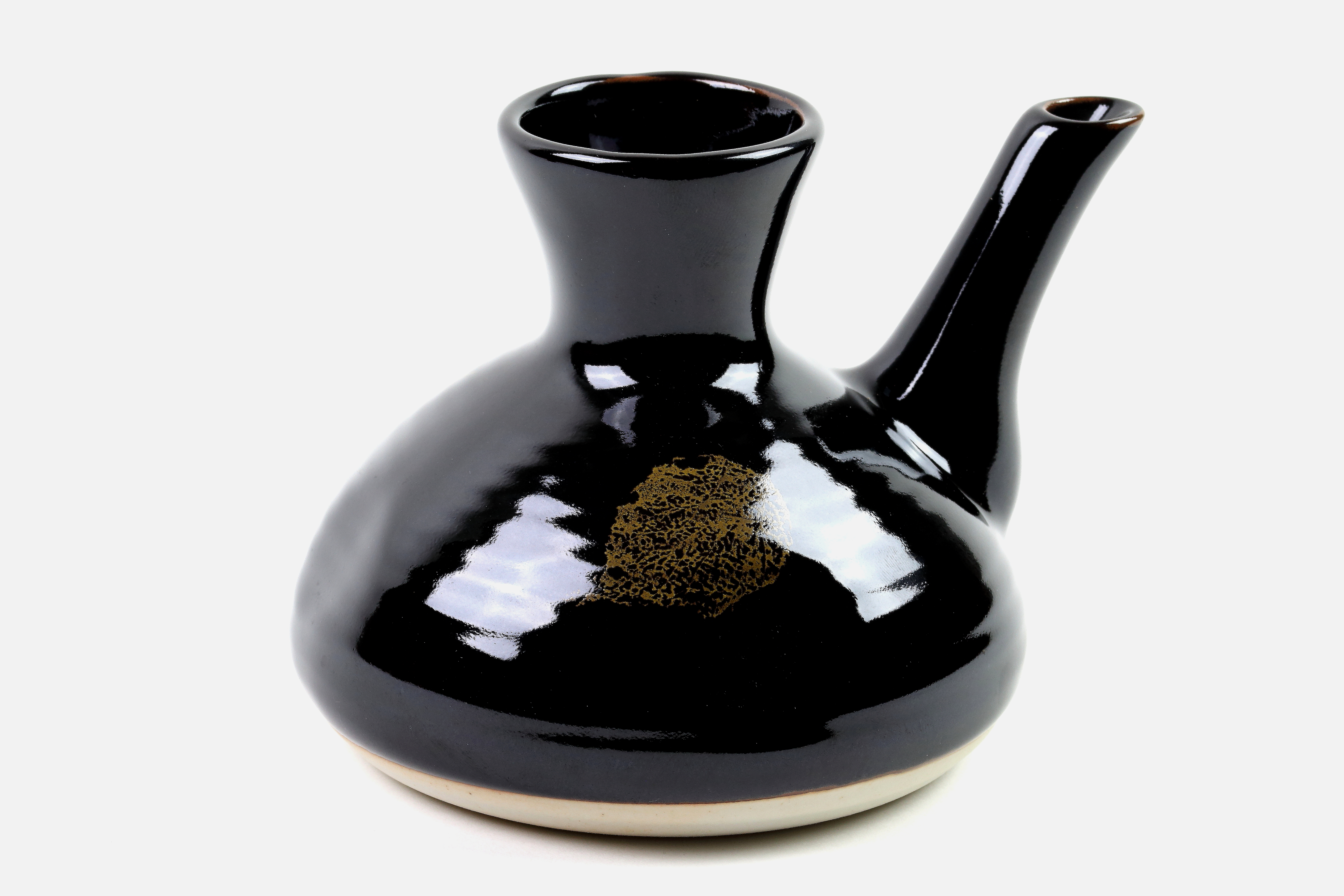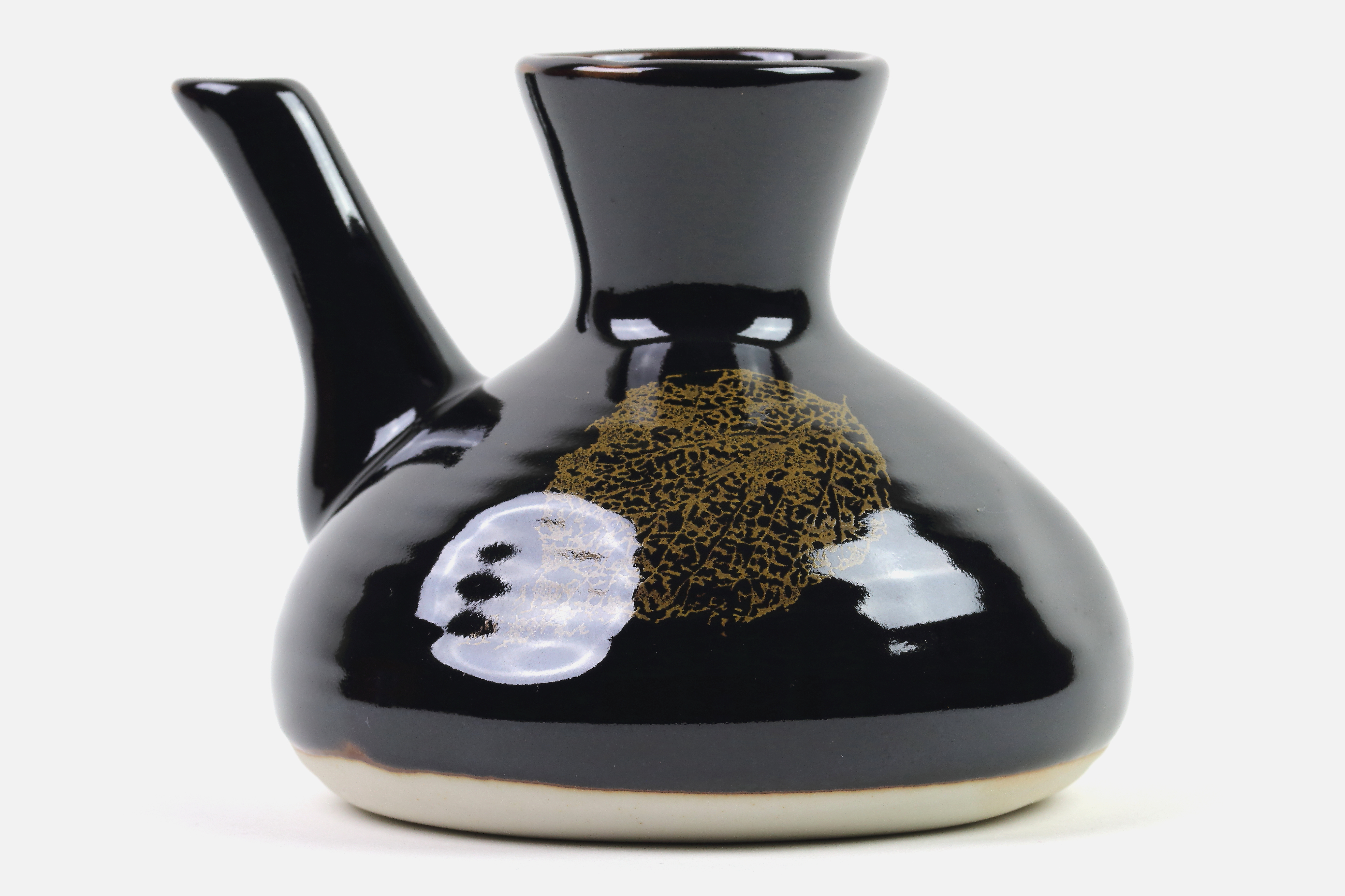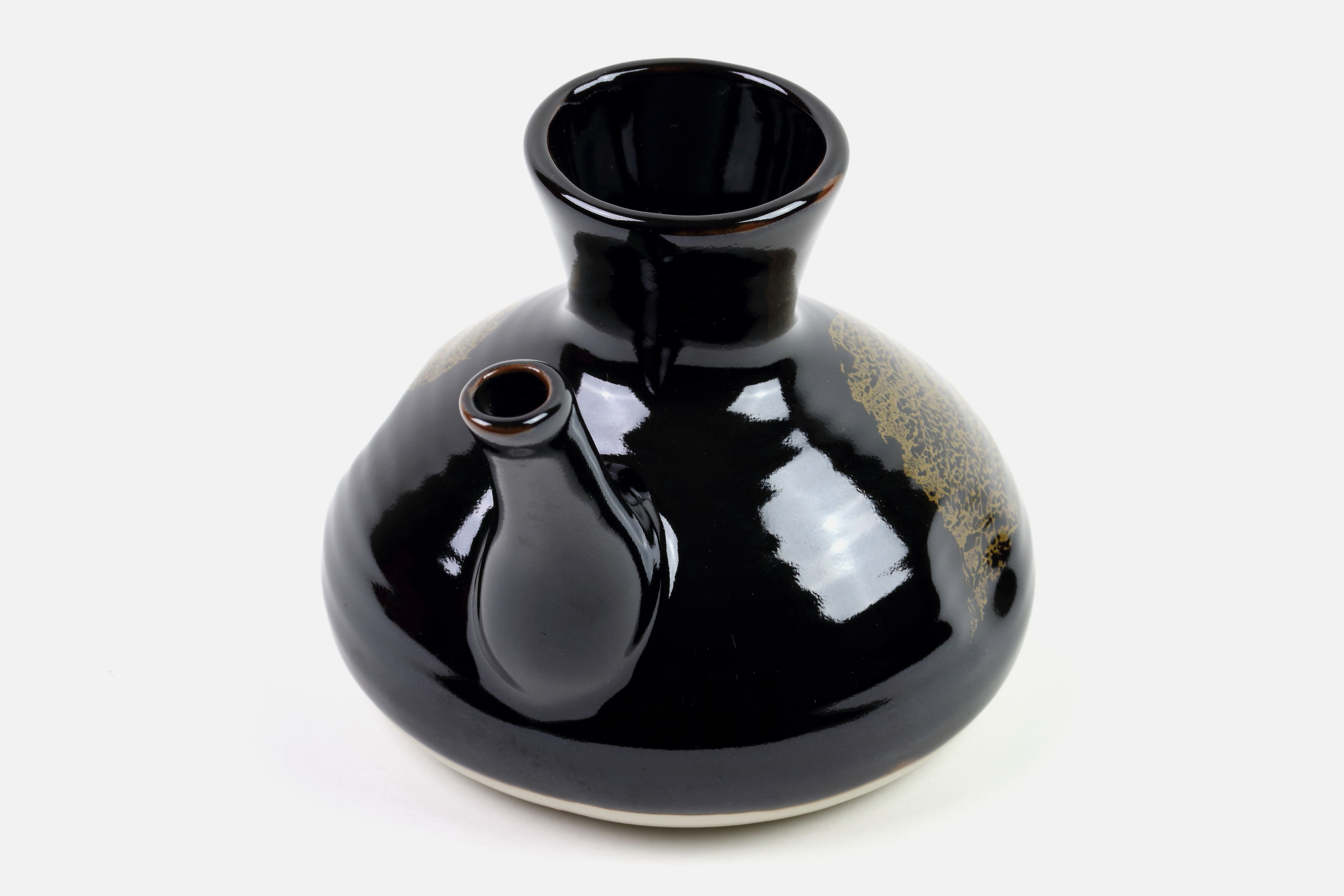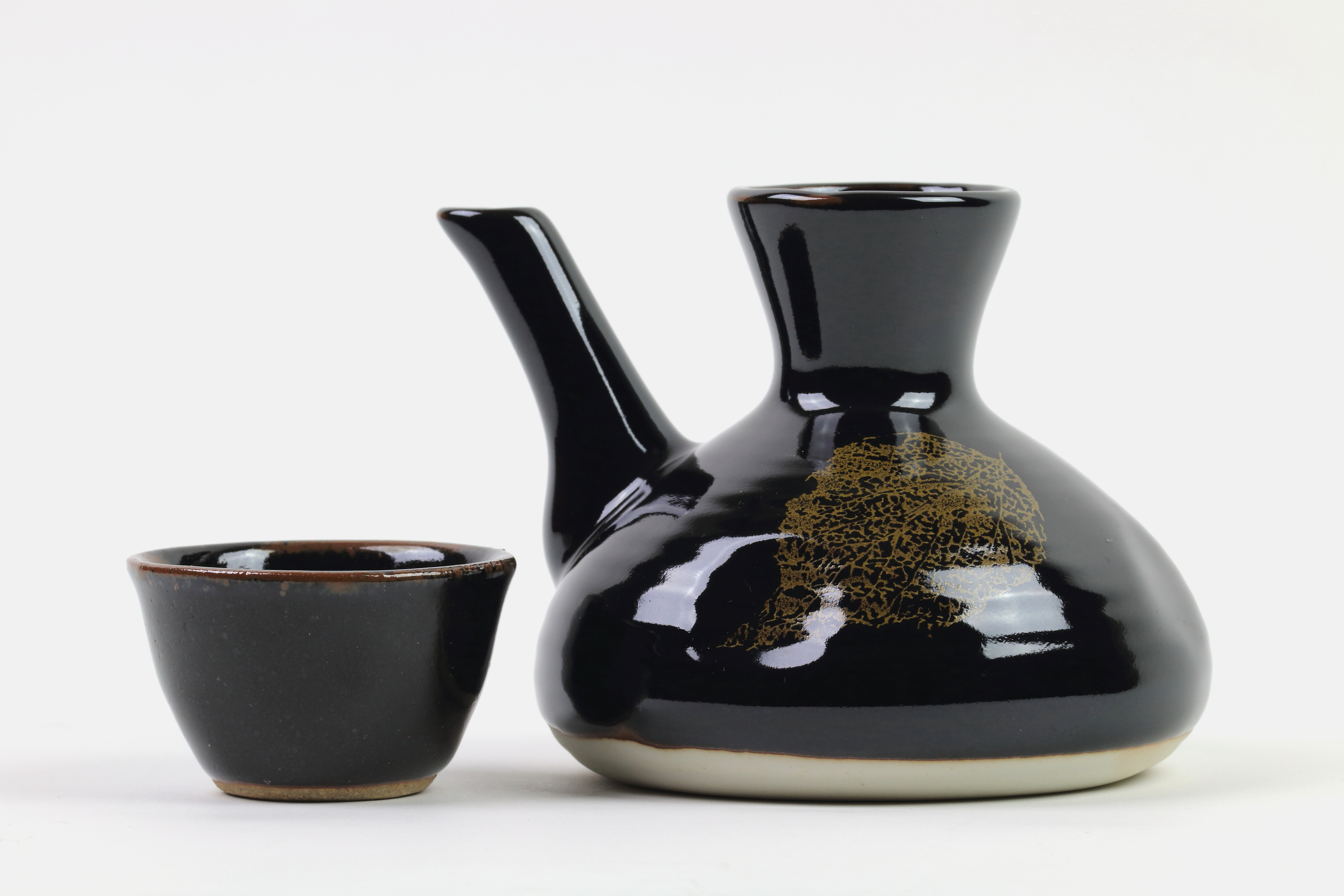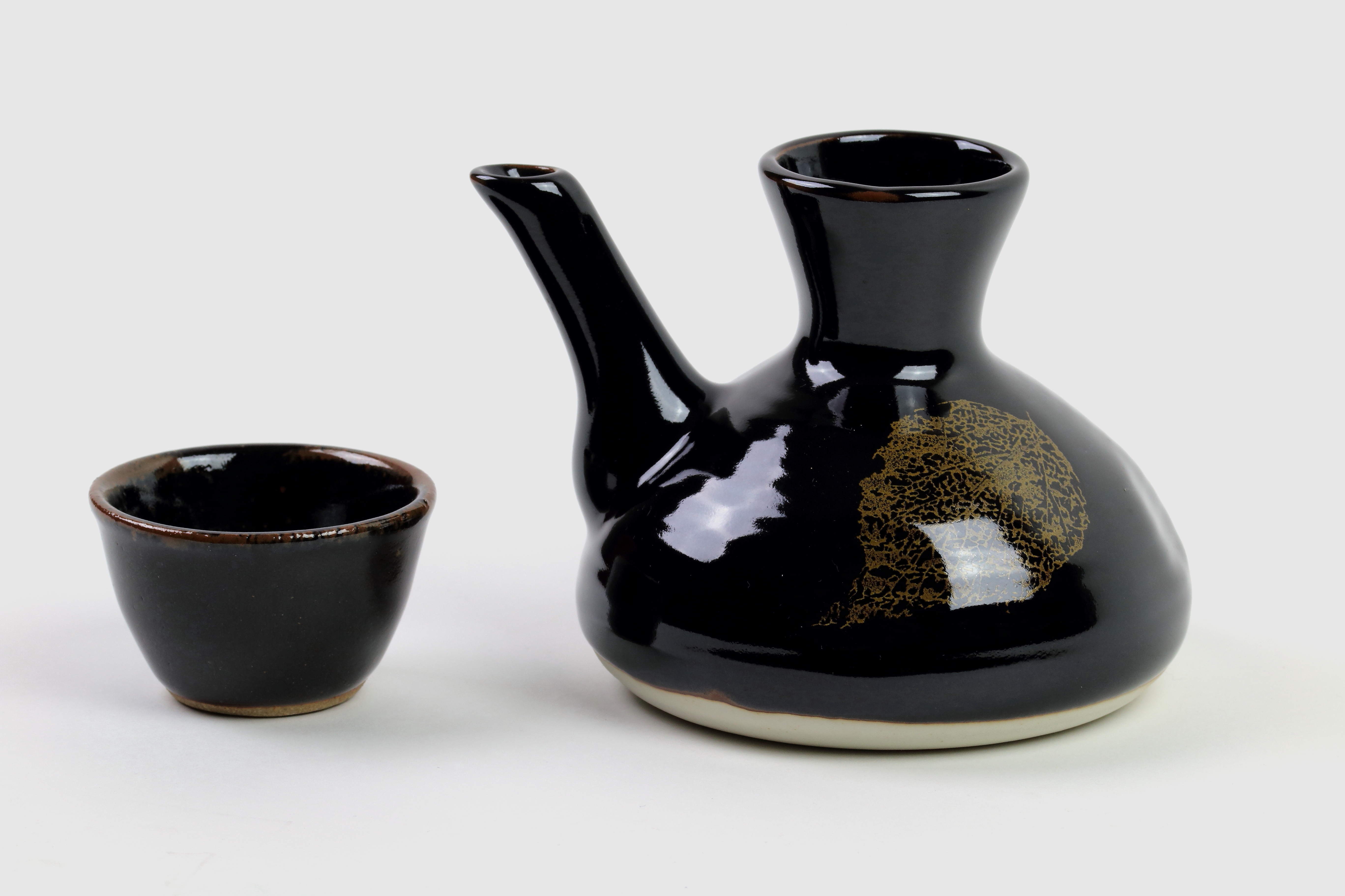 Dieses Sake-Set wurde zwischen 1950 und 1960 gefertigt. Genauer lässt sich das Jahr der Herstellung nicht mehr ermitteln. Deutlich sind die Dellen erkennbar, die beim Eingießen der Sake in den Sakebecher einen sicheren Griff gewähren. Die Sakeflasche wurde mit dem originalgetreu/natürlich wirkendem Muster eines verwelken Blattes versehen.