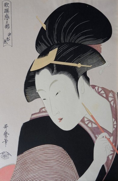 Diese junge Frau ist wahrscheinlich die Geliebte eines der Teehausbesitzer des Schwulenviertels von Shin Yoshiwara. Ihr Haar ist in einem Haarknoten gehalten, ihre Zähne sind schwarz gefärbt (was darauf hindeutet, dass sie eine verheiratete Frau ist), aber ihre Augenbrauen sind unrasiert. In ihrem Ausdruck und ihrer Pose liegt ein Hauch kühler Anmut, und man kann sich vorstellen, dass sie spürt, dass ihre Liebe niemals entdeckt werden wird.